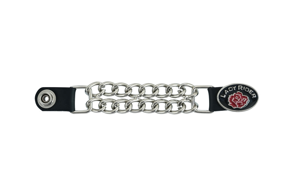 The vest extender also features a chrome motorcycle chain design, giving it a rugged and stylish look.