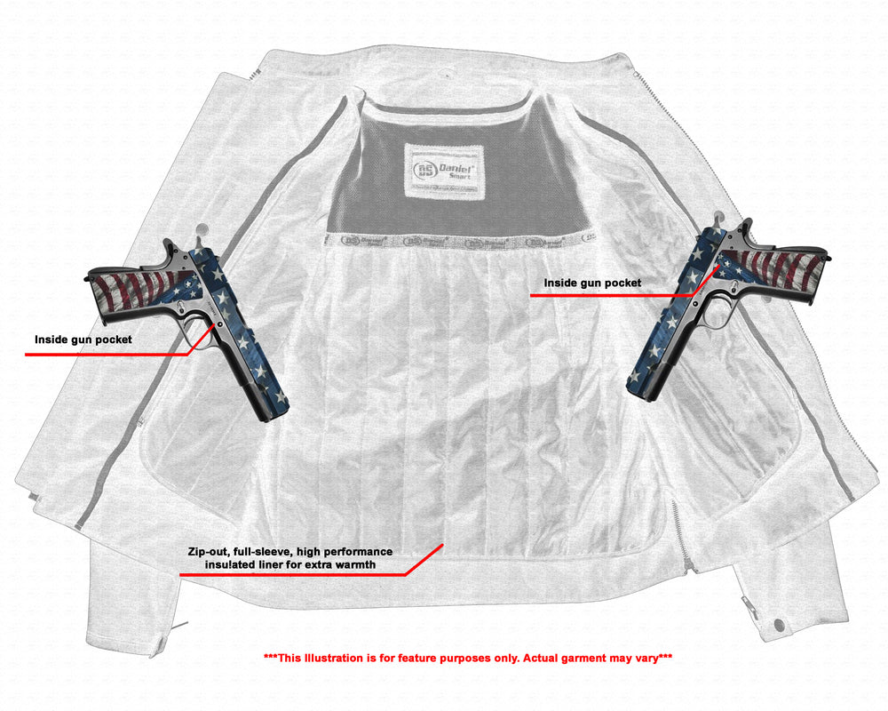 2 inside concealed gun pockets made of special heavy-duty textile with built-in holsters and snap closure.