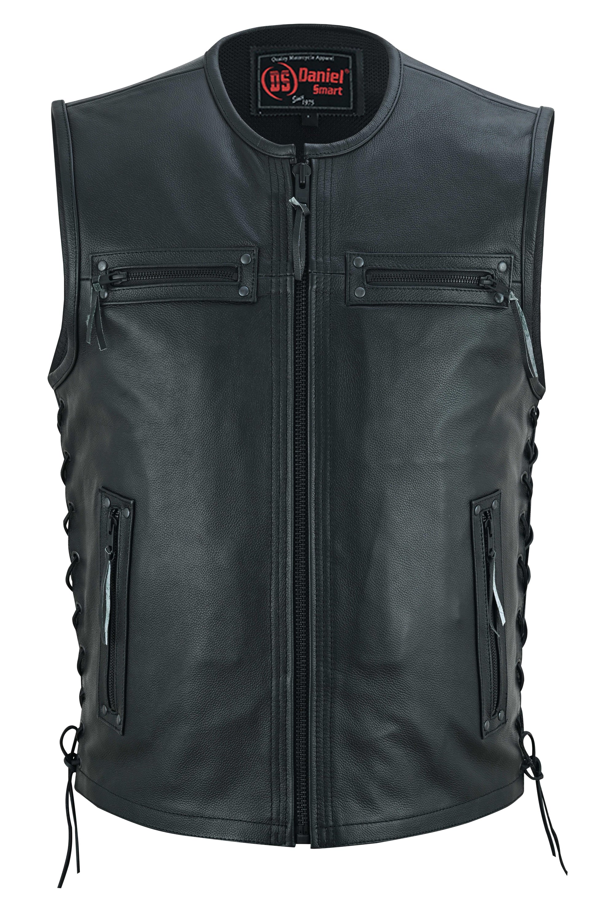 DS Men's Zipper Front Black Leather Motorcycle Vest