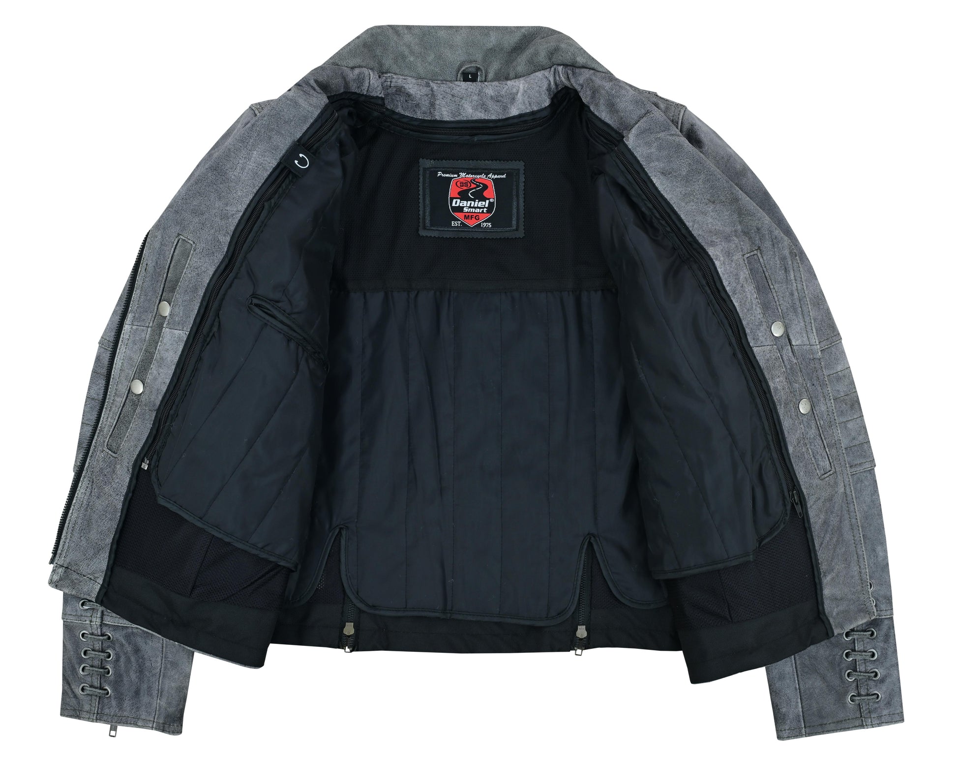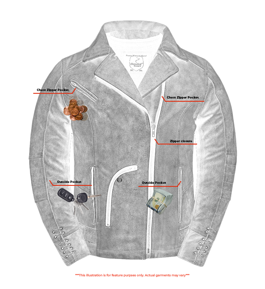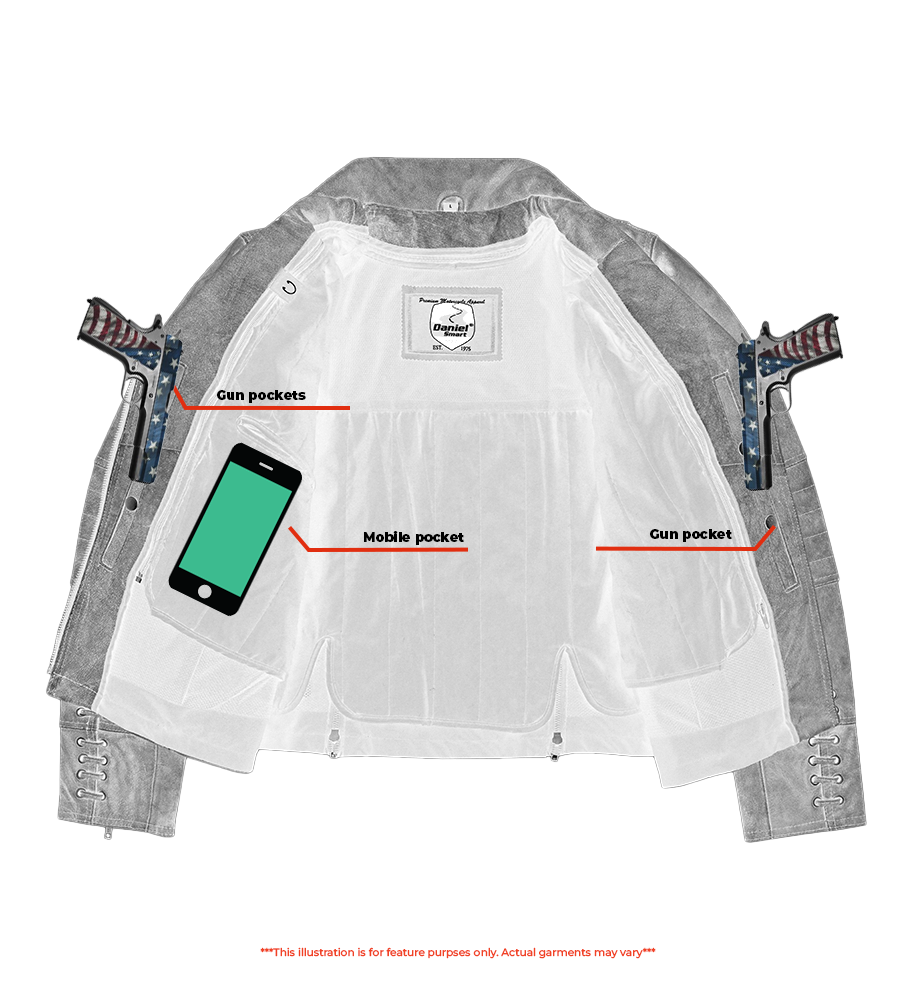 2 inside concealed gun pockets made of special heavy-duty textile with built-in holsters and snap closure.