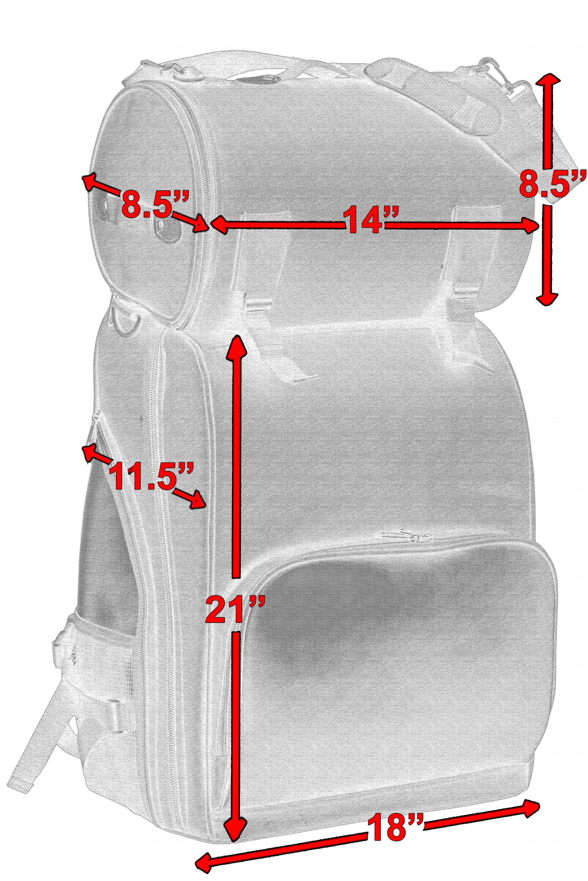 Top roll bag included for extra volume, straps on top of bag secure roll bag or strap down a jacket, or rain gear, etc.