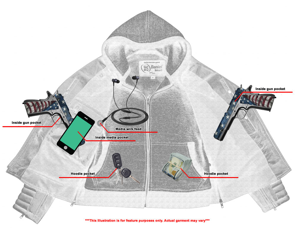 2 inside concealed gun pockets made of special heavy duty textile with built-in holsters and snap closure.