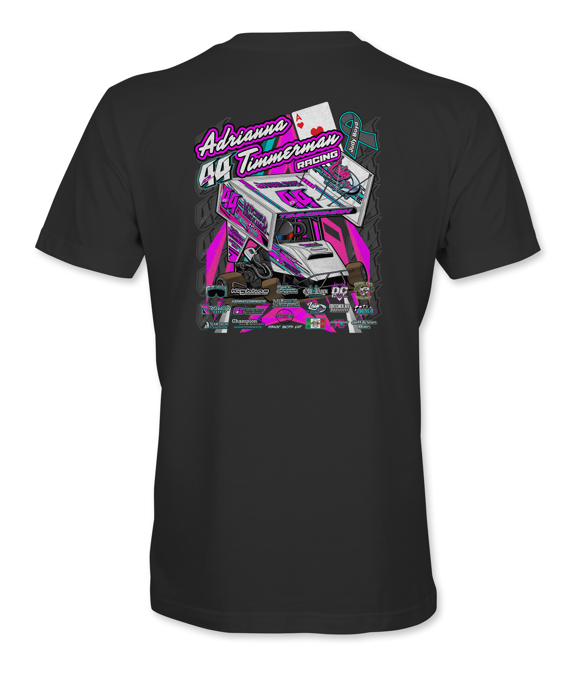 Support Adrianna Timmerman and her team with their custom apparel! Available in Black, Sport Gray, White and Purple. Graphics are direct to garment printed with a left chest image and a full back image.