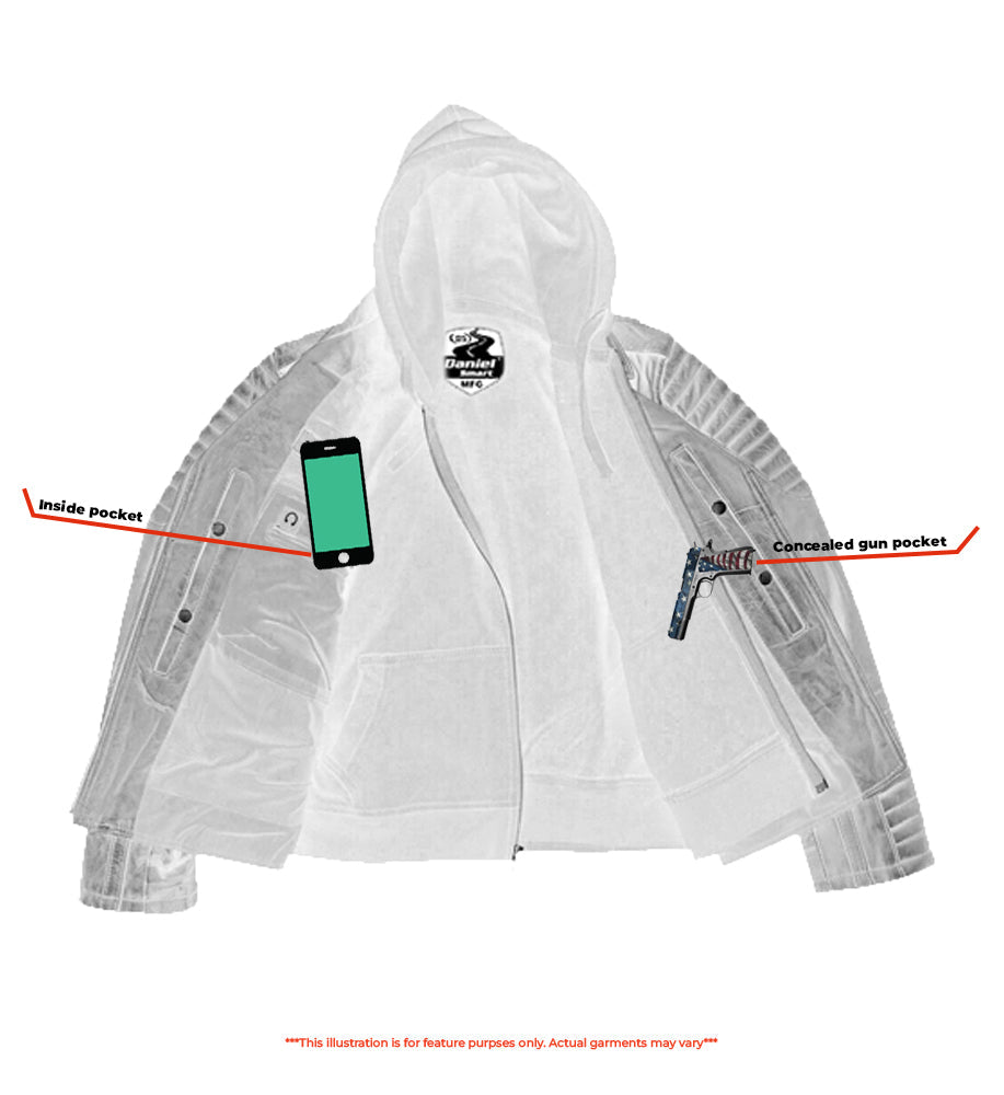 2 inside concealed gun pockets made of special heavy duty textile with built-in holsters and snap closure.
