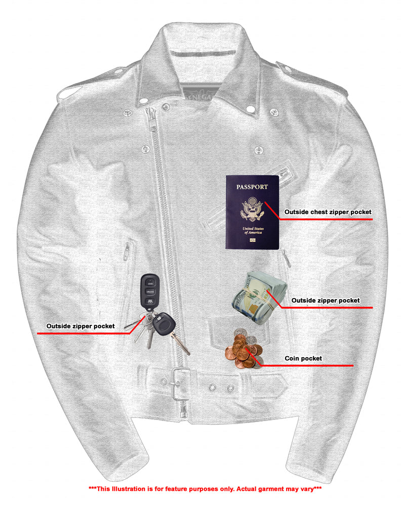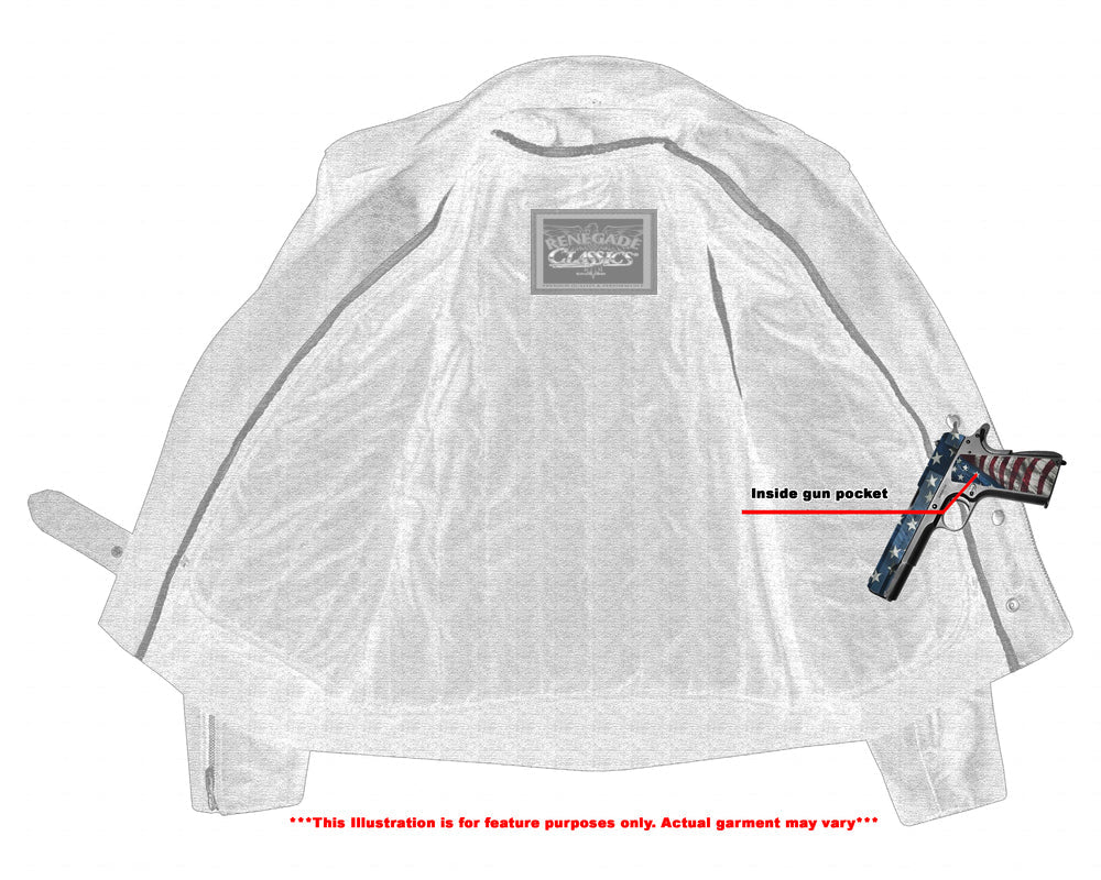 - 1 inside left-hand side concealed gun pocket made of special heavy-duty textile with built-in holsters and snap closure and 1 regular inside pocket.