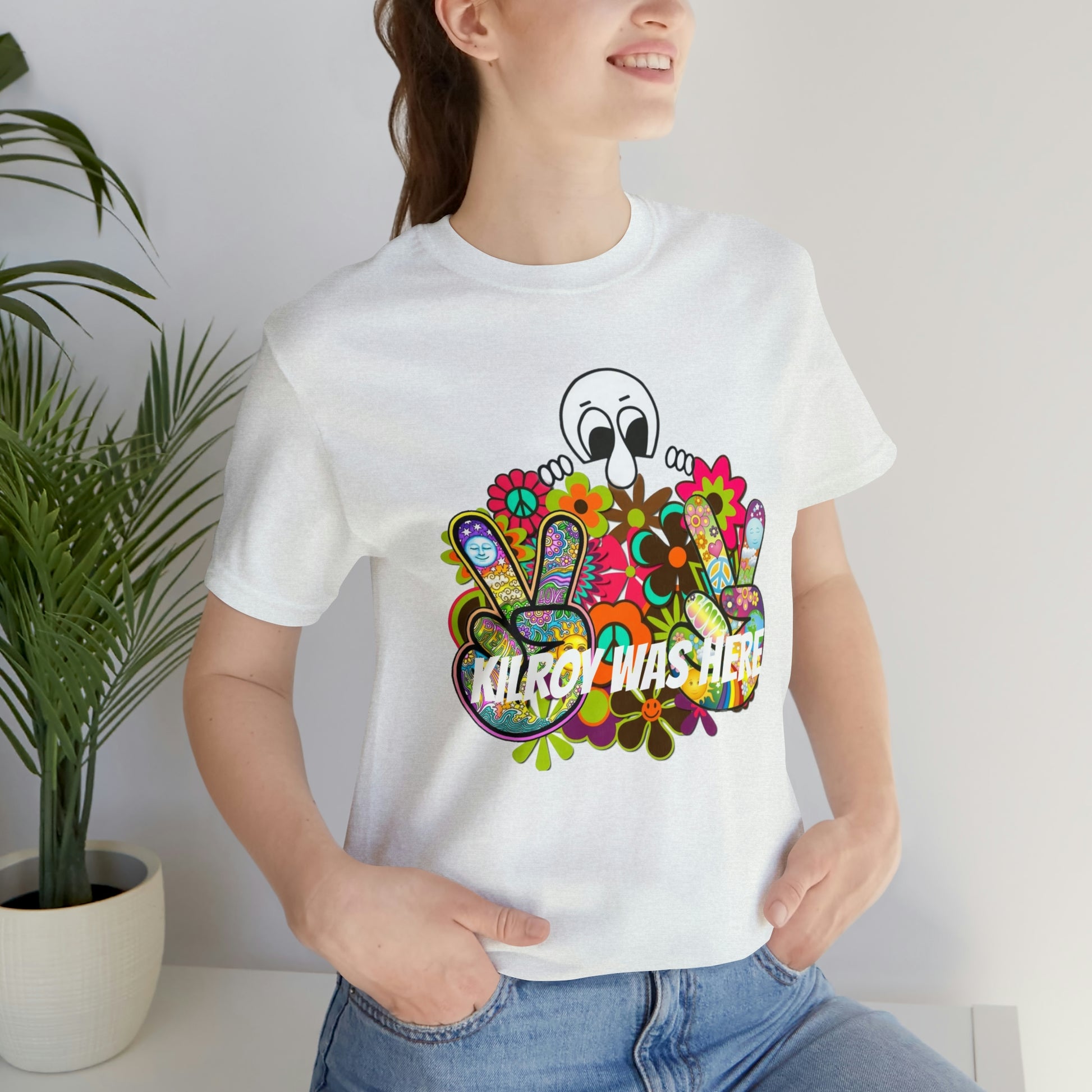 Kilroy Was Here Melded into the 60s. This classic unisex jersey short sleeve tee fits like a glove, and if the Glove Fits .... Soft cotton and quality print make users fall in love with it over and over again. These t-shirts have-ribbed knit collars to bolster shaping. The shoulders have taping for better fit over time. Dual side seams hold the garment's shape for longer.