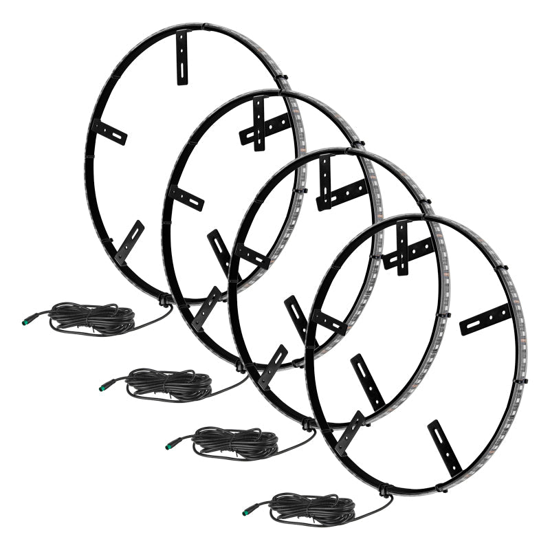 ORACLE Lighting illuminated LED wheel rings are an easy and effective way to light up the wheels on your car or truck! This head-turning lighting product consists of a set of (4) LED illuminated aluminum rings which install around the brake rotor and attaches to the brake dust shield. These can also be mounted to older vehicles with drum brakes. The effect is a large ring of light which accents custom wheels and stands out at events. Oversized 16.5" diameter is the largest on the market and fits oversized brakes. This kit now features a TRUE white 6000K from separate white LEDs for a TRUE WHITE output for a Crisp & Clean white light. Change Colors, Control Brightness, access strobing patterns, and sync with music! Now featuring Dual-Control allowing the user to use both the free Bluetooth Smartphone App control PLUS the included Wireless Remote Control. Installation is easy with waterproof Plug & Play Connectors that easily connect the individual rings to the central control box. Battery connection leads include ring terminals and in-line fuse for simplified wiring installation. There is also a pre-wired On/Off switch that can be used to manually turn the system on and off for maximum control. Additional upgrades to our LED wheel lights include thicker aluminum rings, black powder-coat anti-corrosive finish, waterproof connectors, and pre-installed brackets. Installation tip: For extra security of the screws holding in the brackets on wheel rings, first confirm that the wheel rings' brackets are in the correct mounting location. Then, apply an appropriate amount of Loctite to these screws to ensure a firm hold. If your vehicle is equipped with drum brakes or does not have a brake dust shield you will need to perform additional fabrication of brackets to fit properly. Please note, these rings are not intended for use while driving.