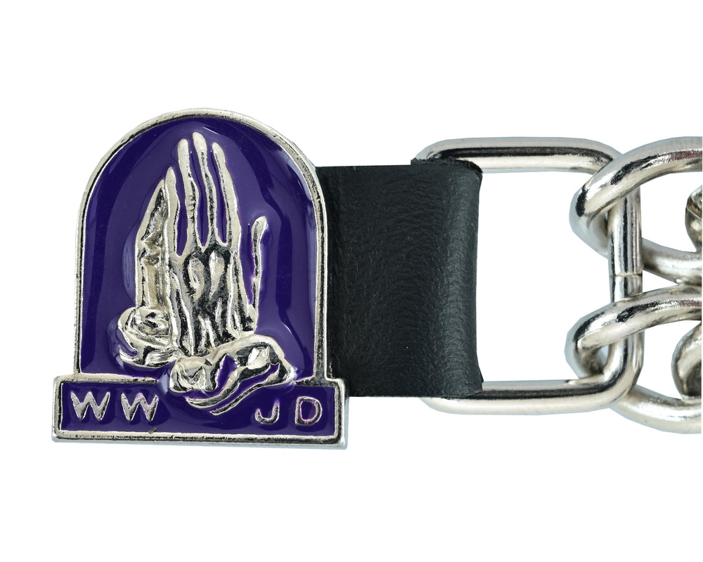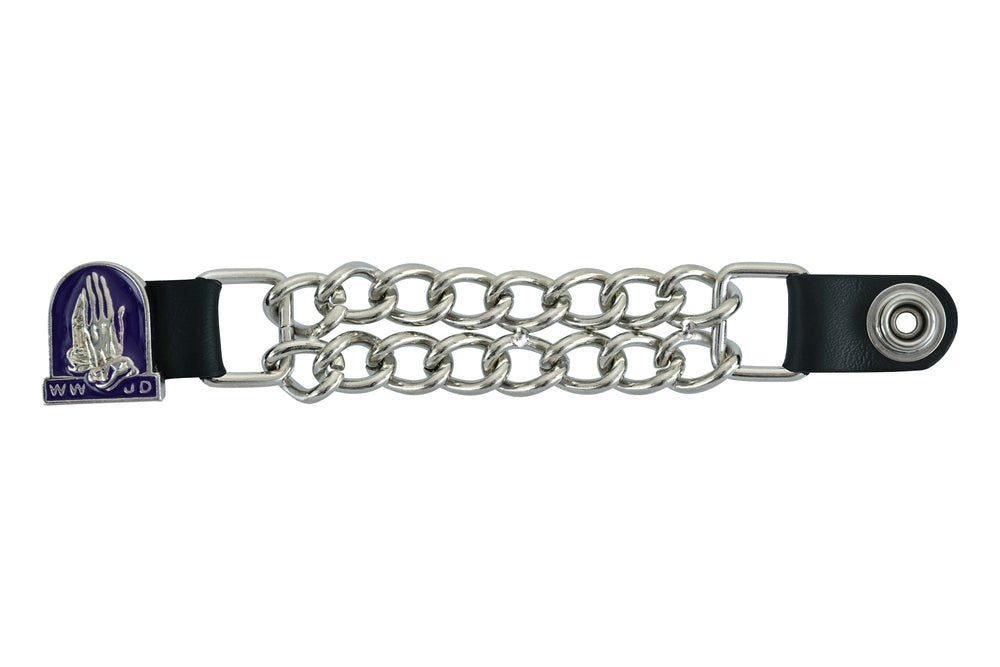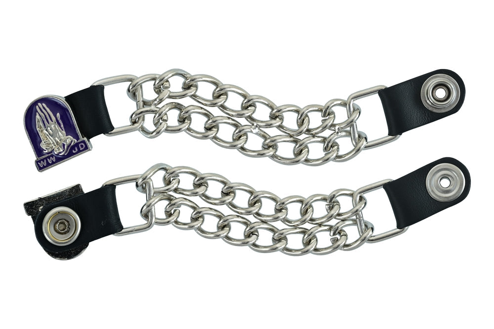 The vest extender also features a chrome motorcycle chain design, giving it a rugged and stylish look.