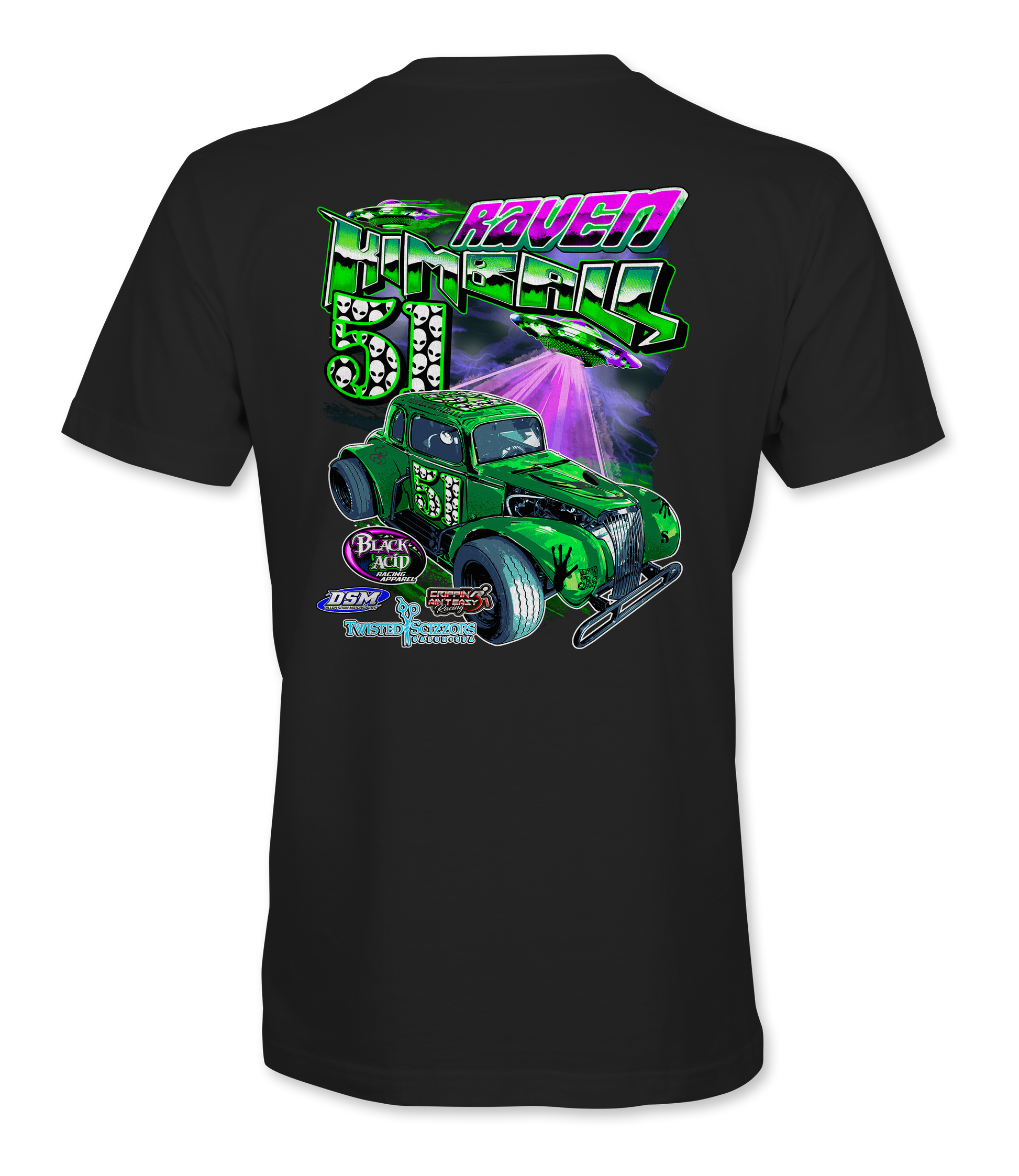 Support Raven Kimball and her team with their custom apparel! Available in Black and Ash Gray. Graphics are direct to garment printed with a left chest image and a full back image.