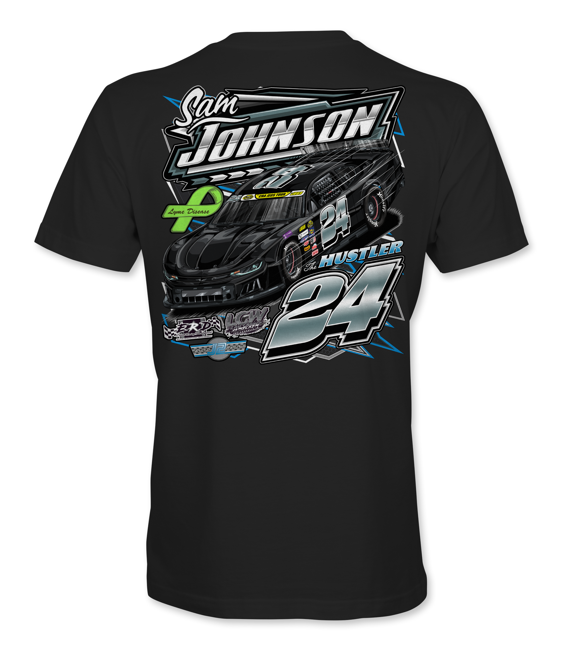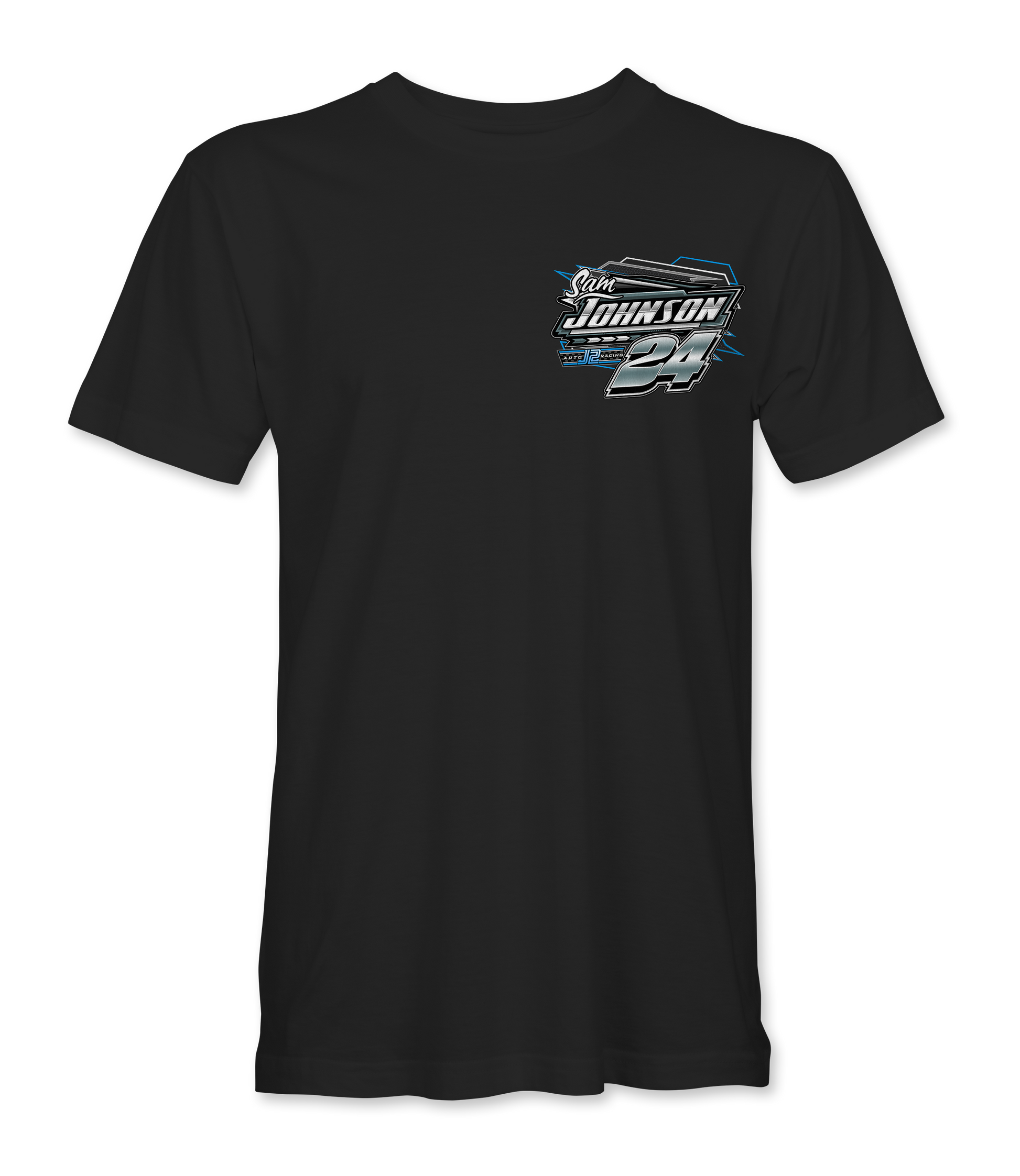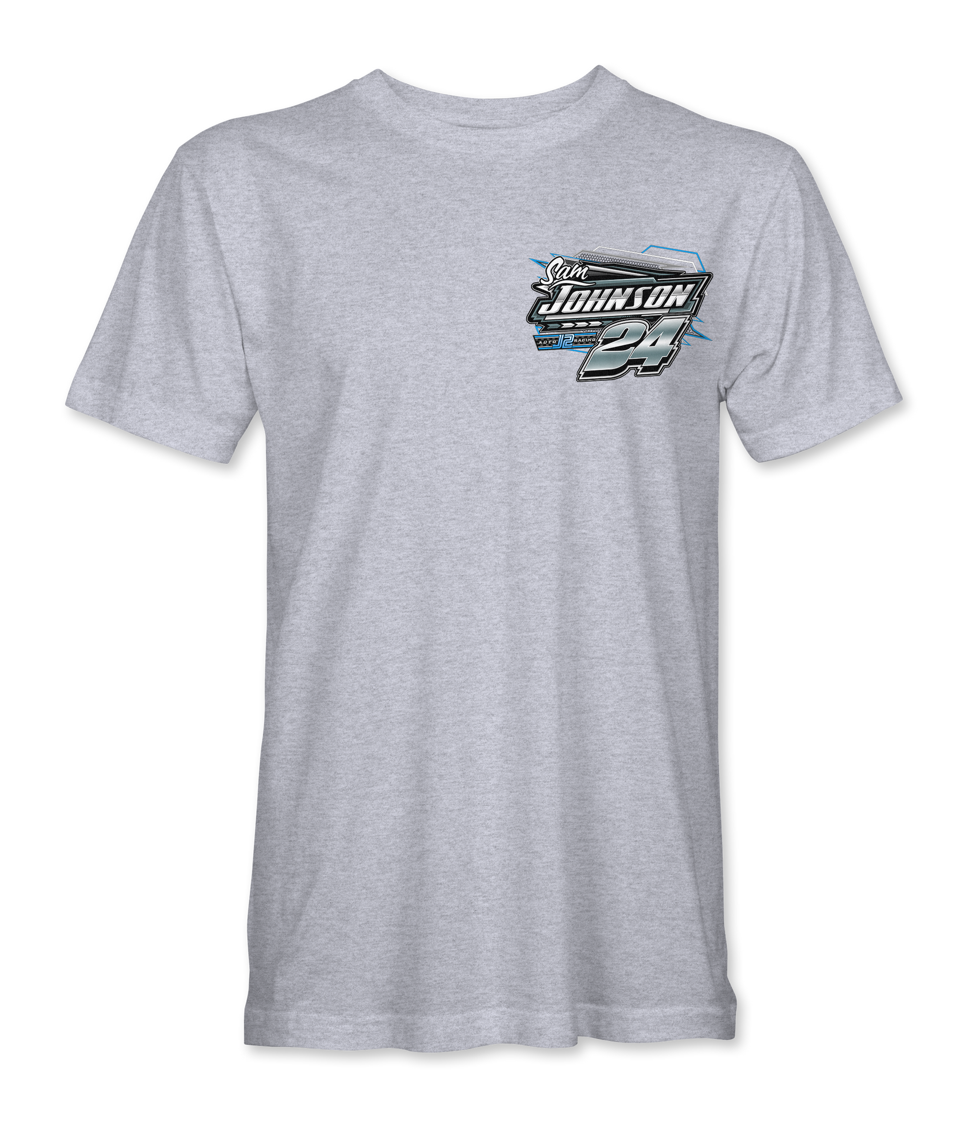 Support Sam Johnson with their custom apparel! Available in Black, Sports Gray and White. Graphics are direct to garment printed with a left chest image and a full back image.