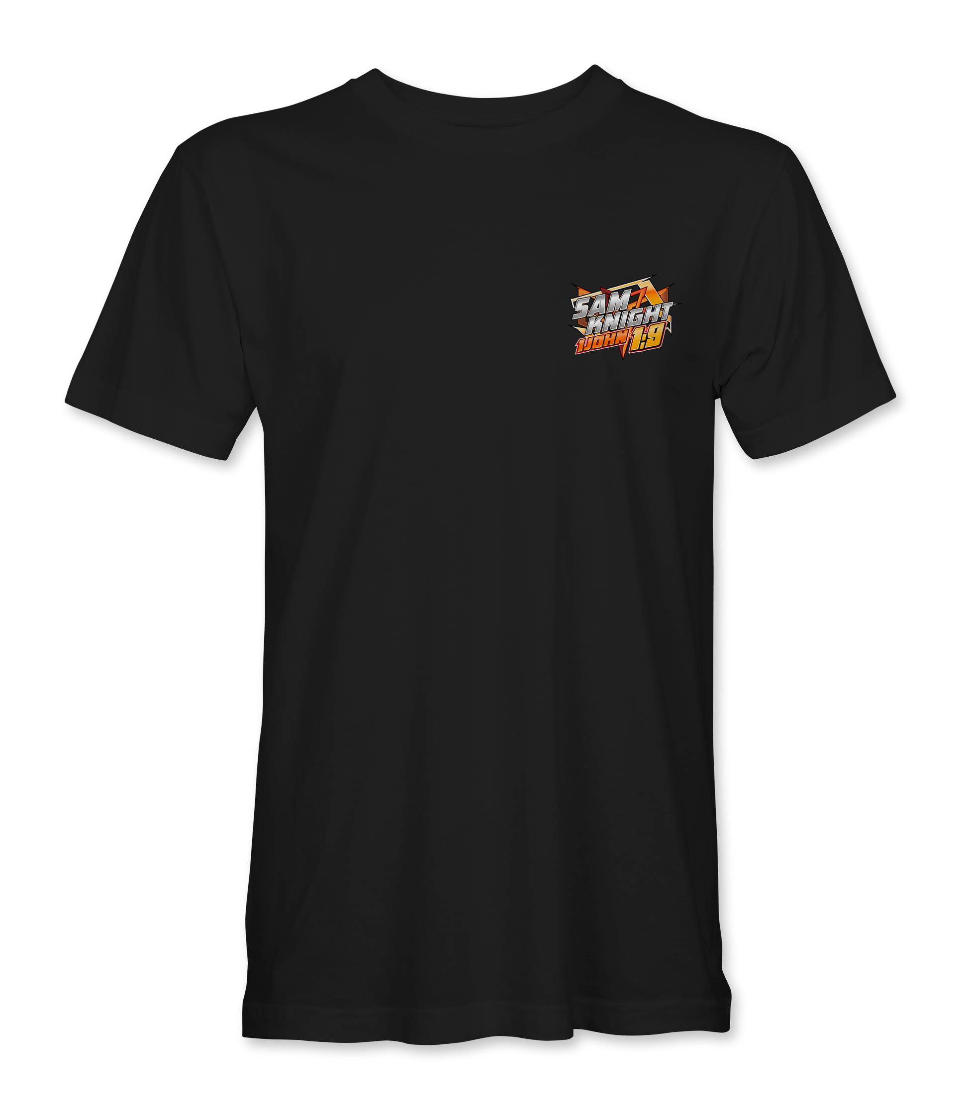 Support Sam Knight and his team with their custom apparel! Available in Black. Graphics are direct to garment printed with a left chest image and a full back image.