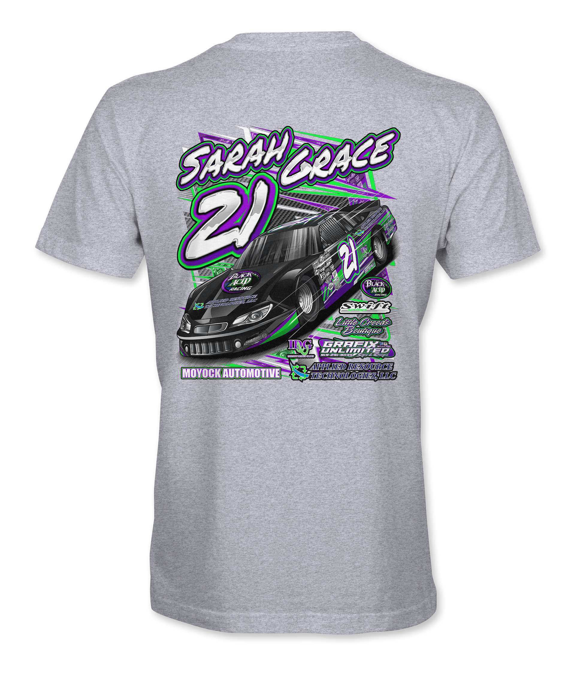 Support Sarah Grace Whitesell with their custom apparel! Available in Black, Purple and Sport Gray. Graphics are direct to garment printed with a left chest image and a full back image.