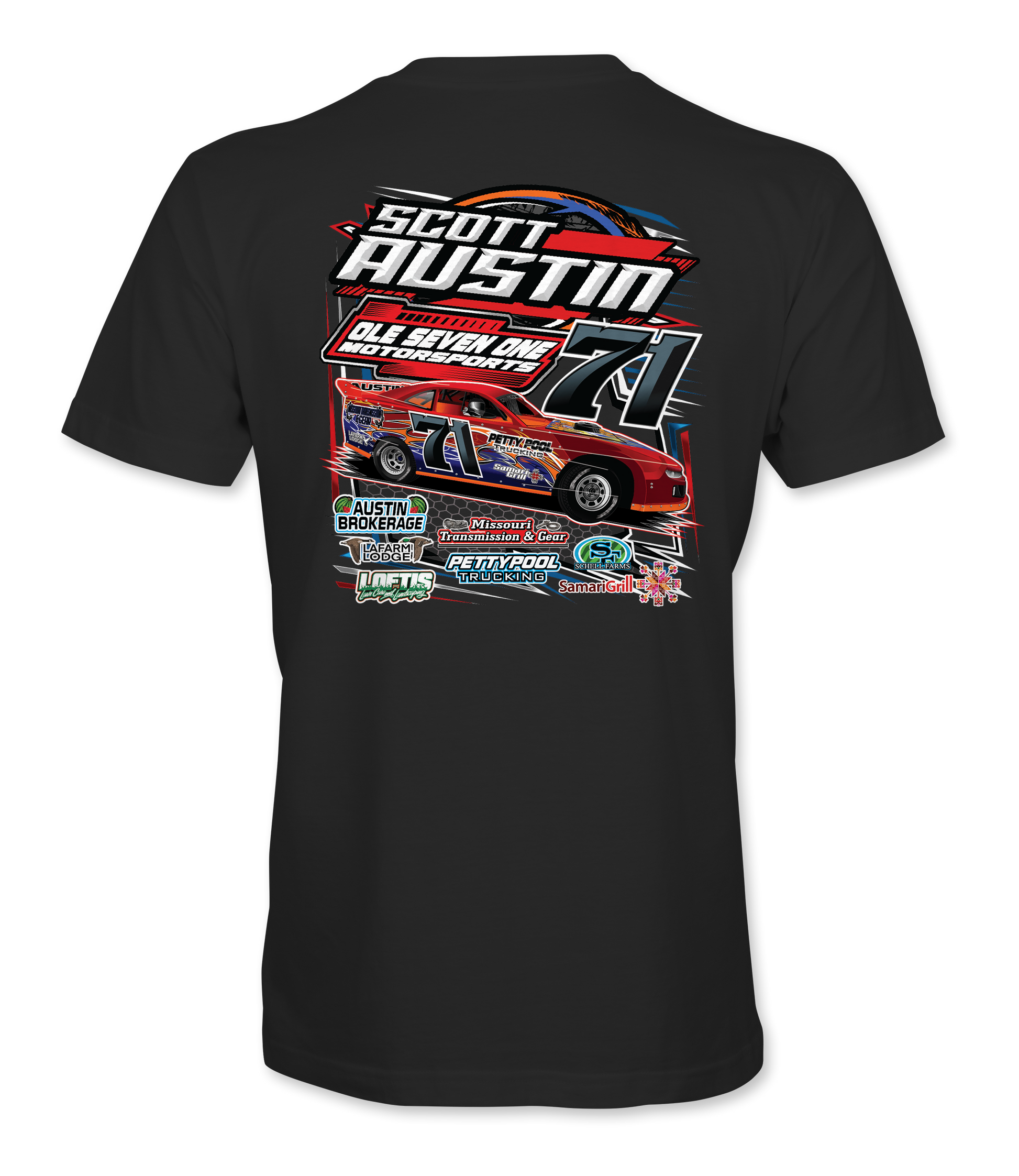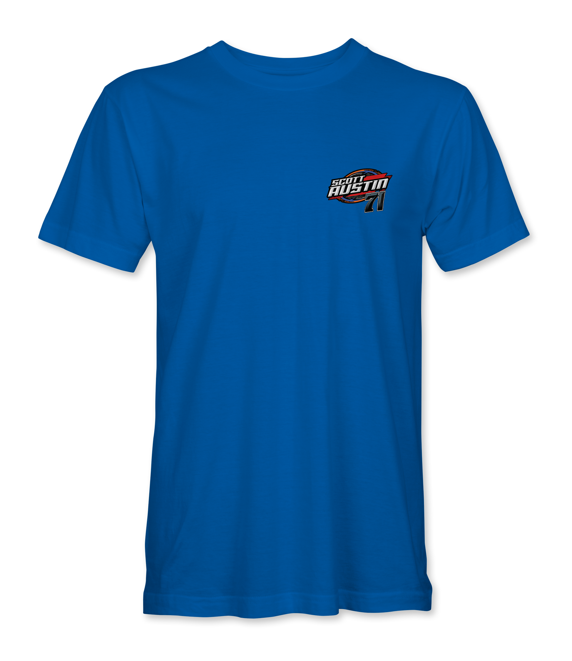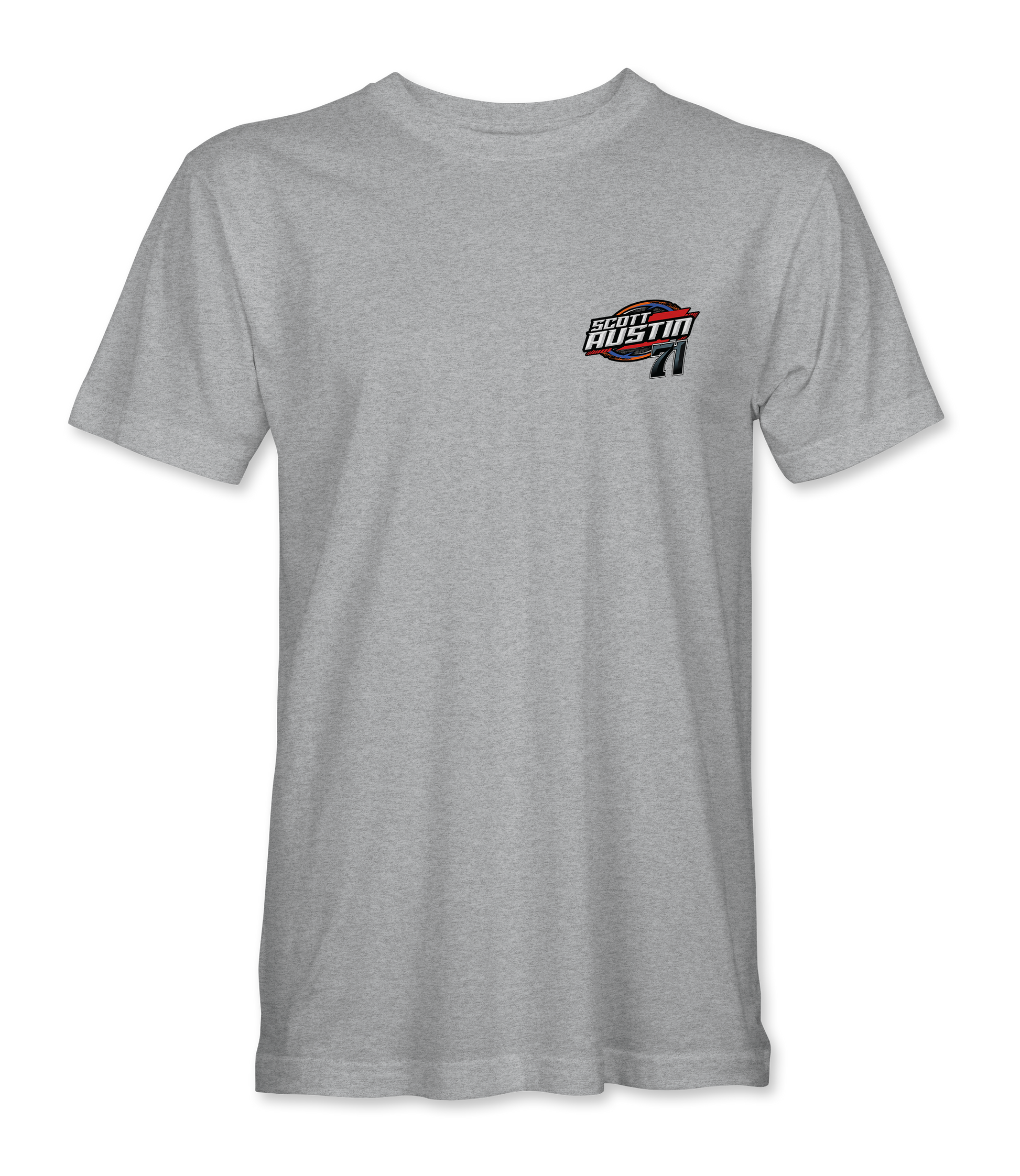 Support Scott Austin and his team with their custom apparel! Available in Black, Sport Gray and Royal Blue. Graphics are direct to garment printed with a left chest image and a full back image.