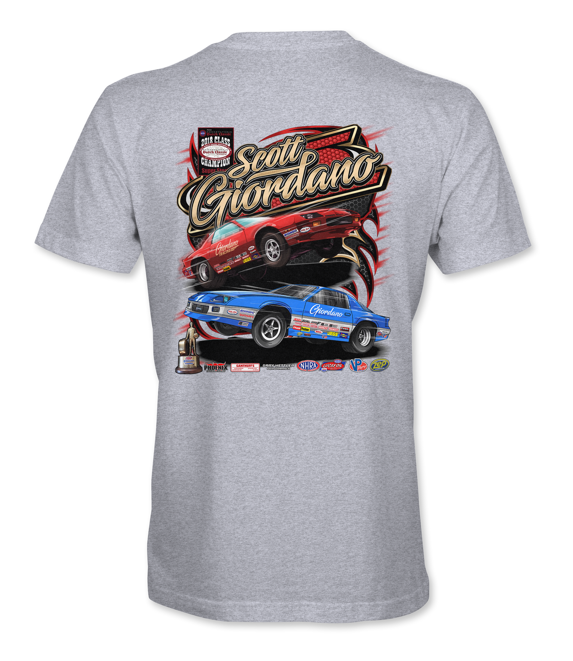 Support Scott Giordano with their custom apparel! Available in Red, Royal Blue, Sport Gray, Tropical Blue and Coral Silk. Graphics are direct to garment printed with a left chest image and a full back image.