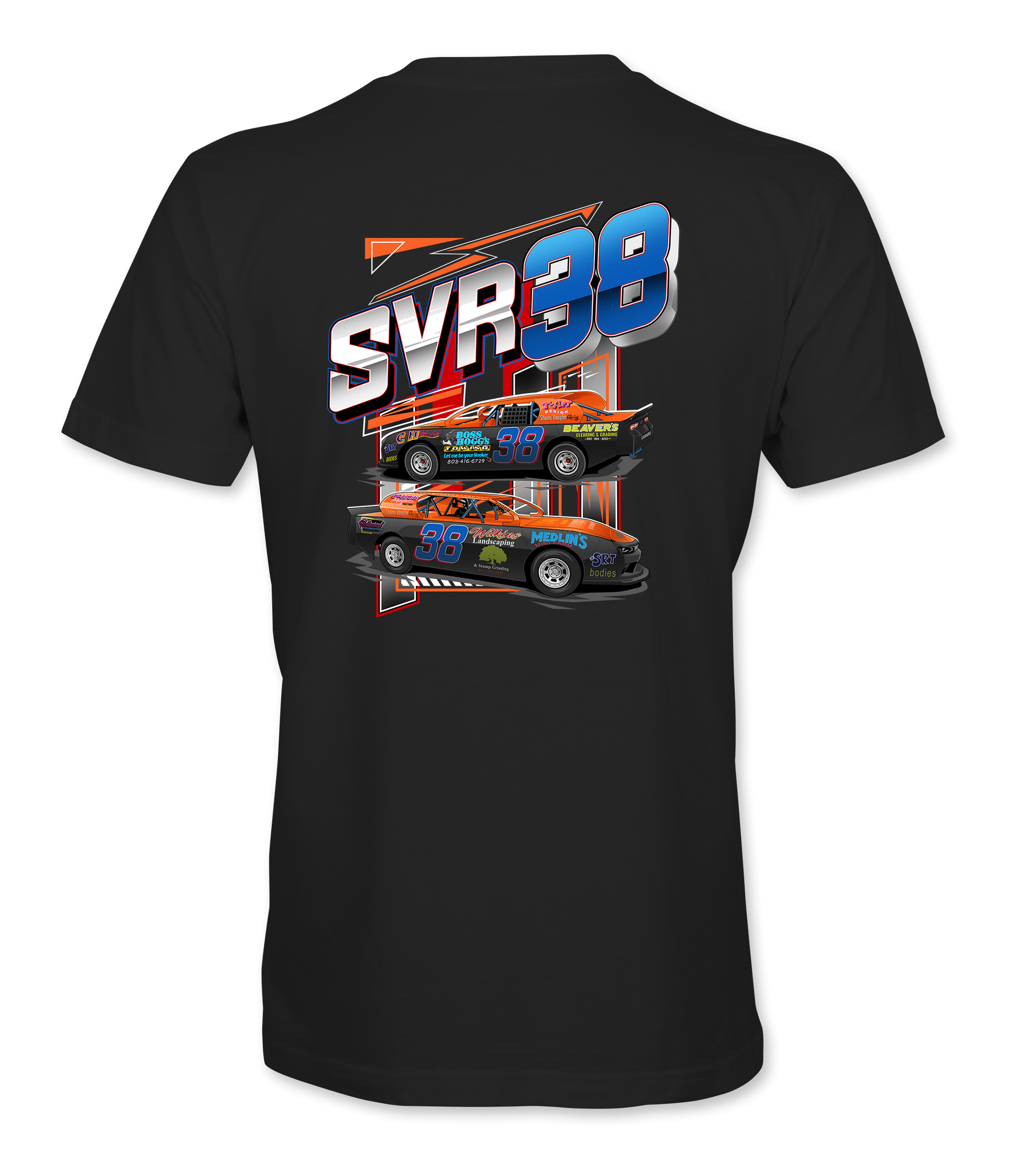 Support Shane Vaughn and his team with their custom apparel! Available in Black, White, Blue & Orange. Graphics are direct to garment printed with a left chest image and a full back image.