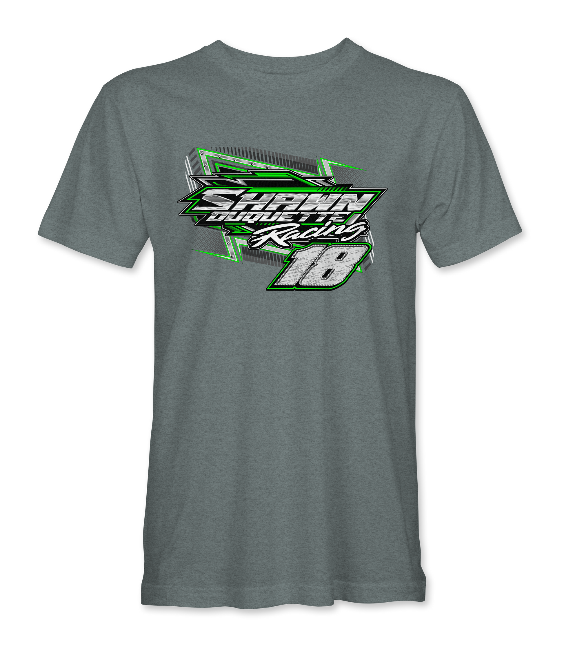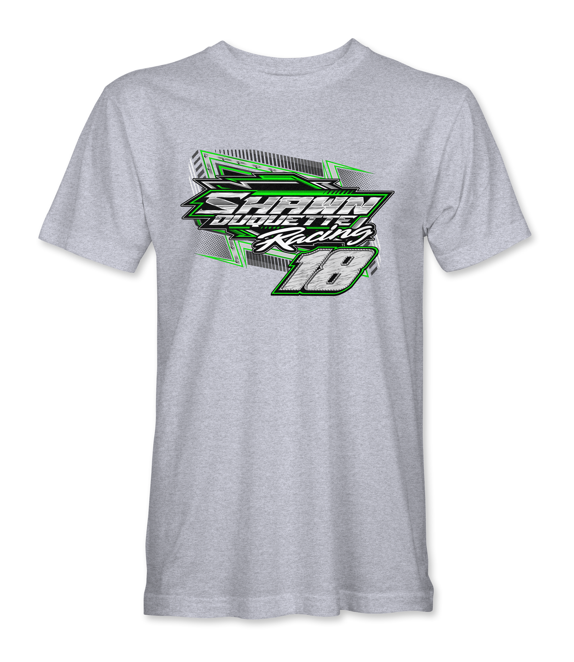 Support Shawn Duquette with their custom apparel! Available in Black, Sport Gray, Dark Heather Gray, Light Pink and Irish Green. Graphics are direct to garment printed with a left chest image and a full back image.