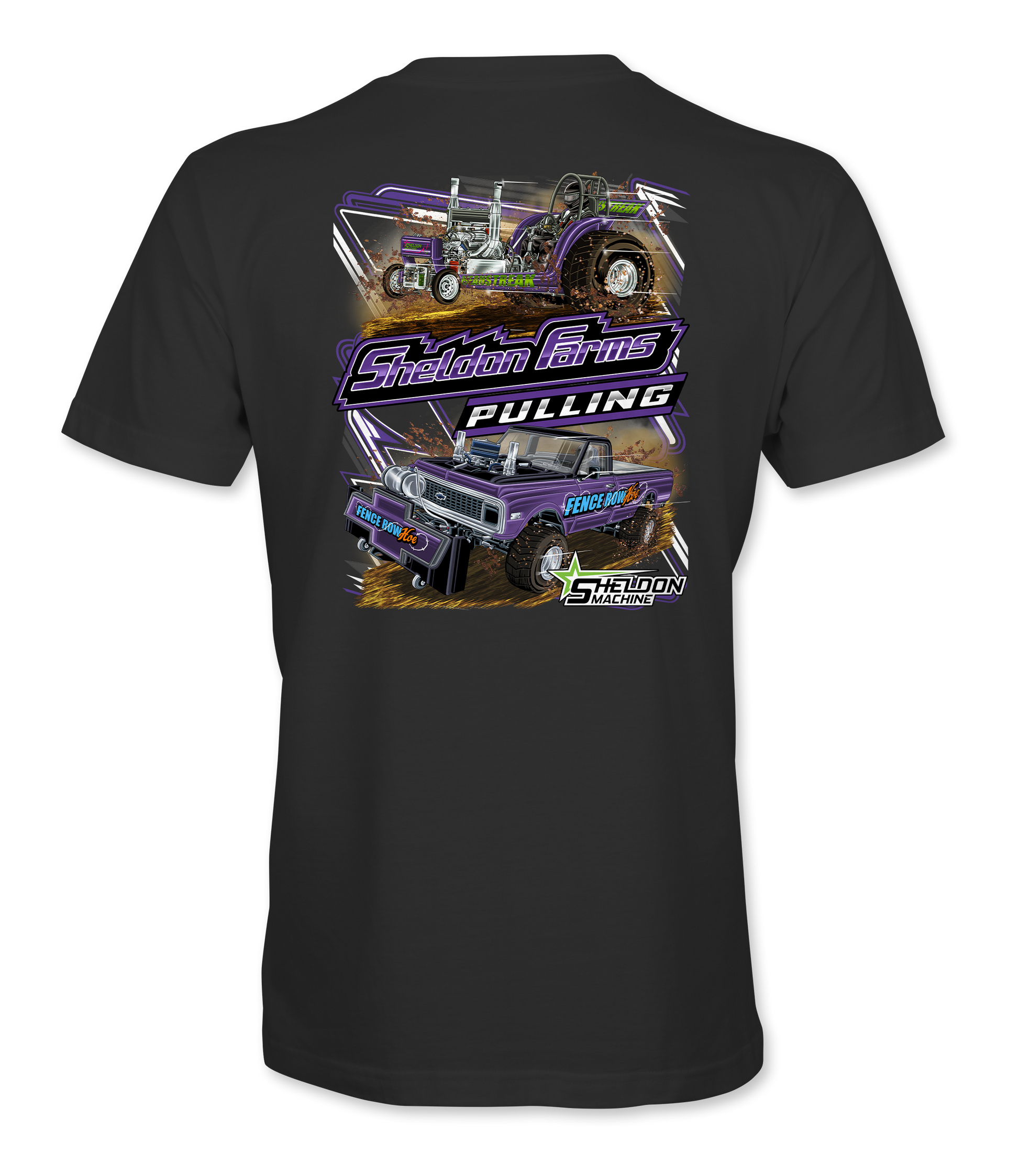 Support the Sheldon Farms Pulling team with their custom apparel! Available in Black. Graphics are direct to garment printed with a left chest image and a full back image.