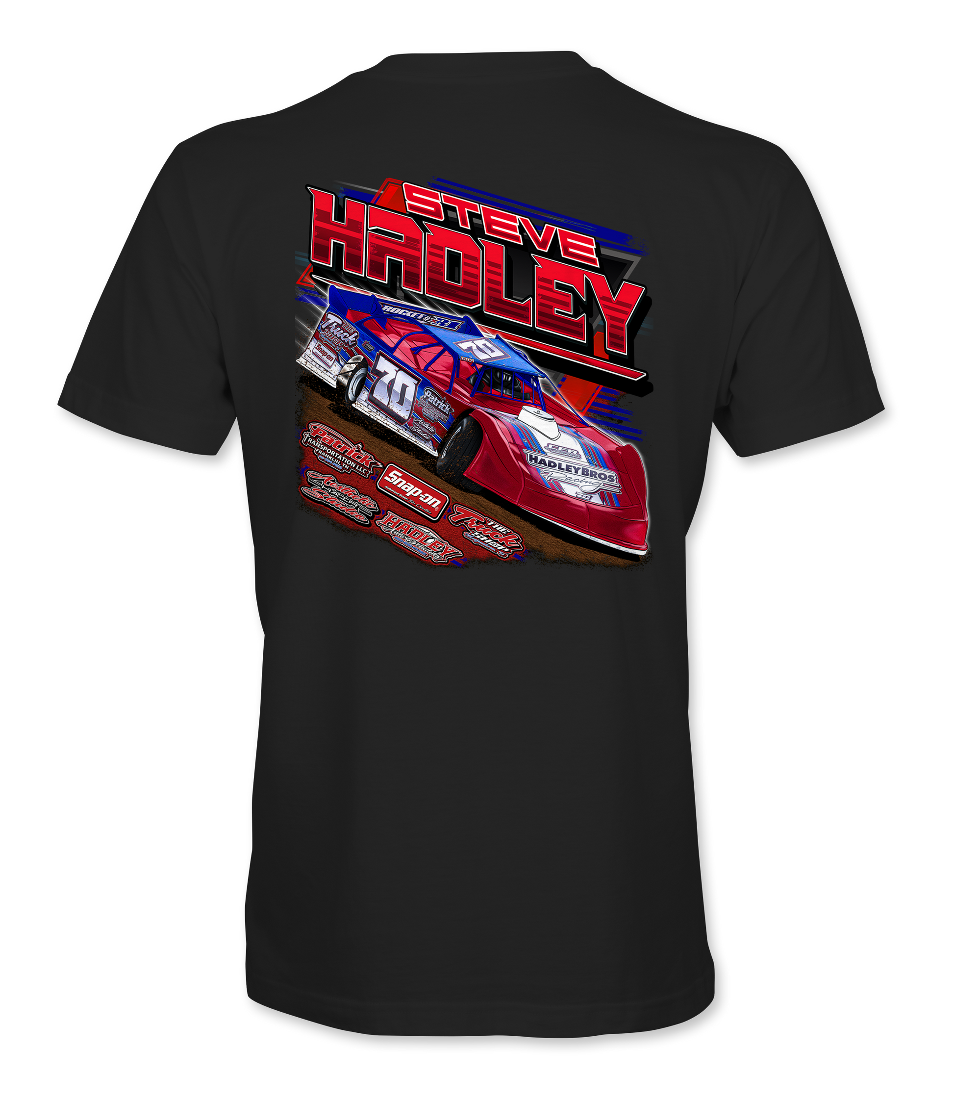 Support Steve Hadley with their custom apparel! Available in Black, Dark Heather Gray, Royal Blue, Red and White. Graphics are direct to garment printed with a left chest image and a full back image.