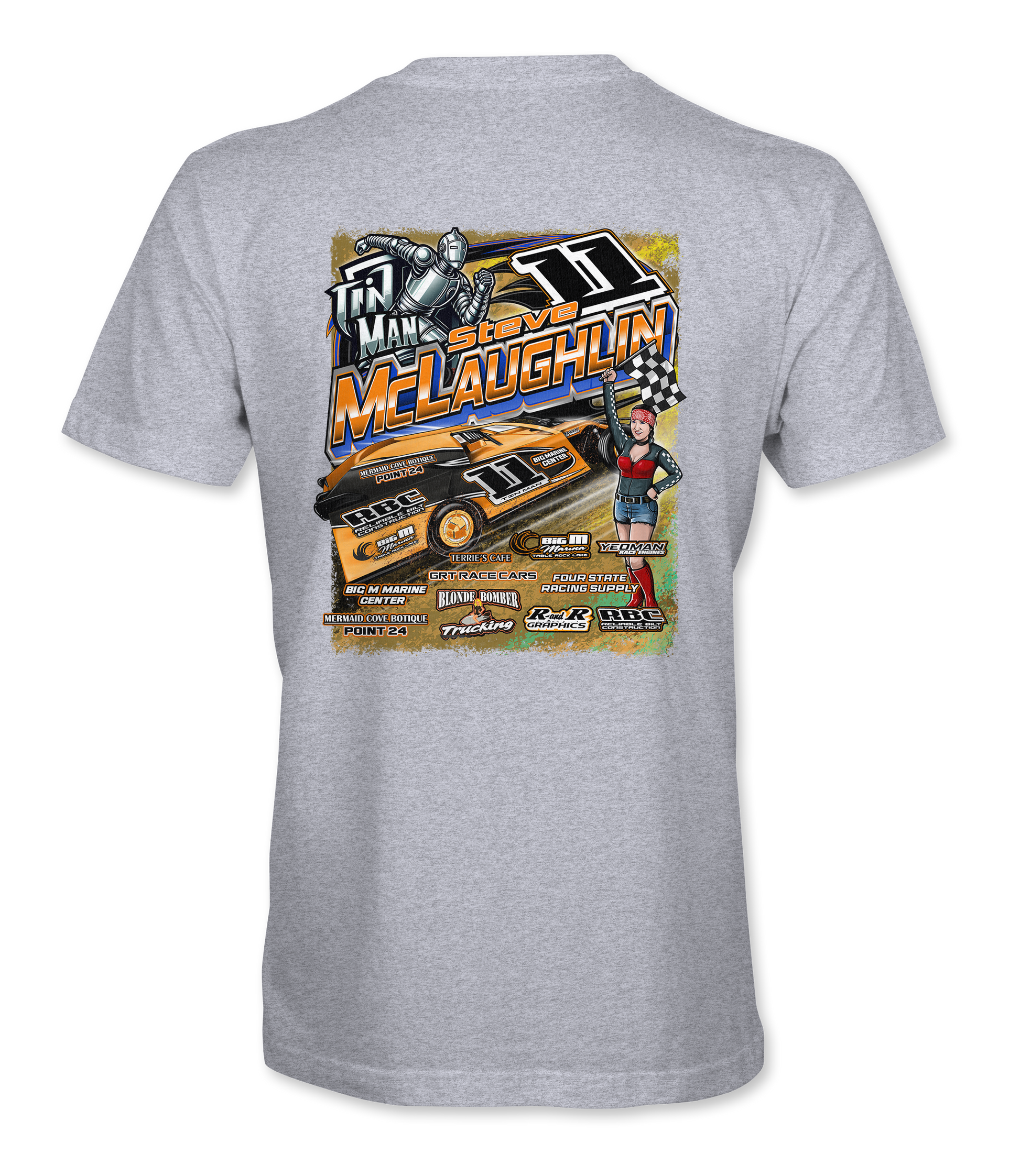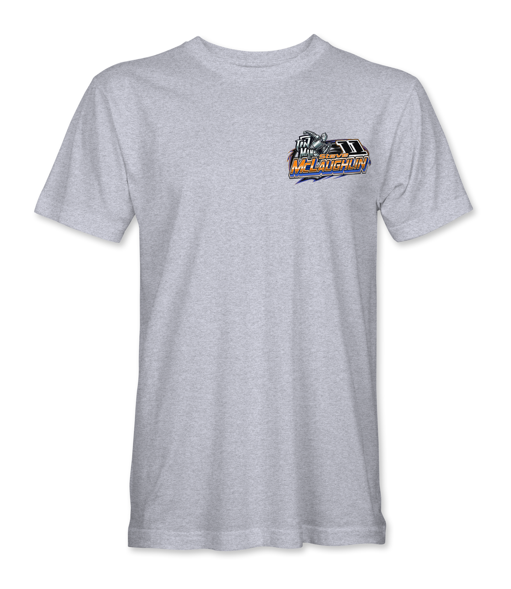 Support Steve McLaughlin with their custom apparel! Available in Black, Sport Gray and White. Graphics are direct to garment printed with a left chest image and a full back image.