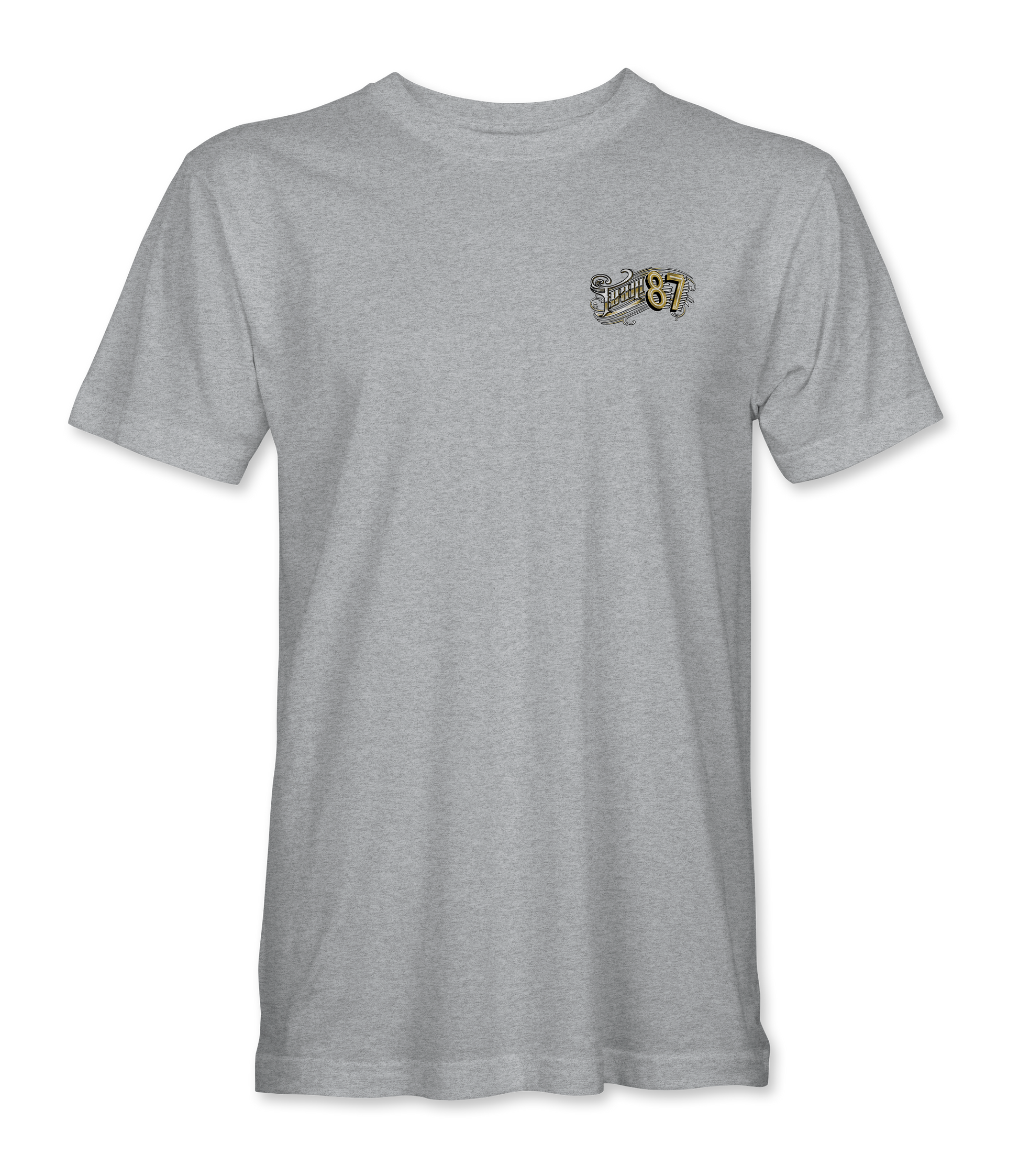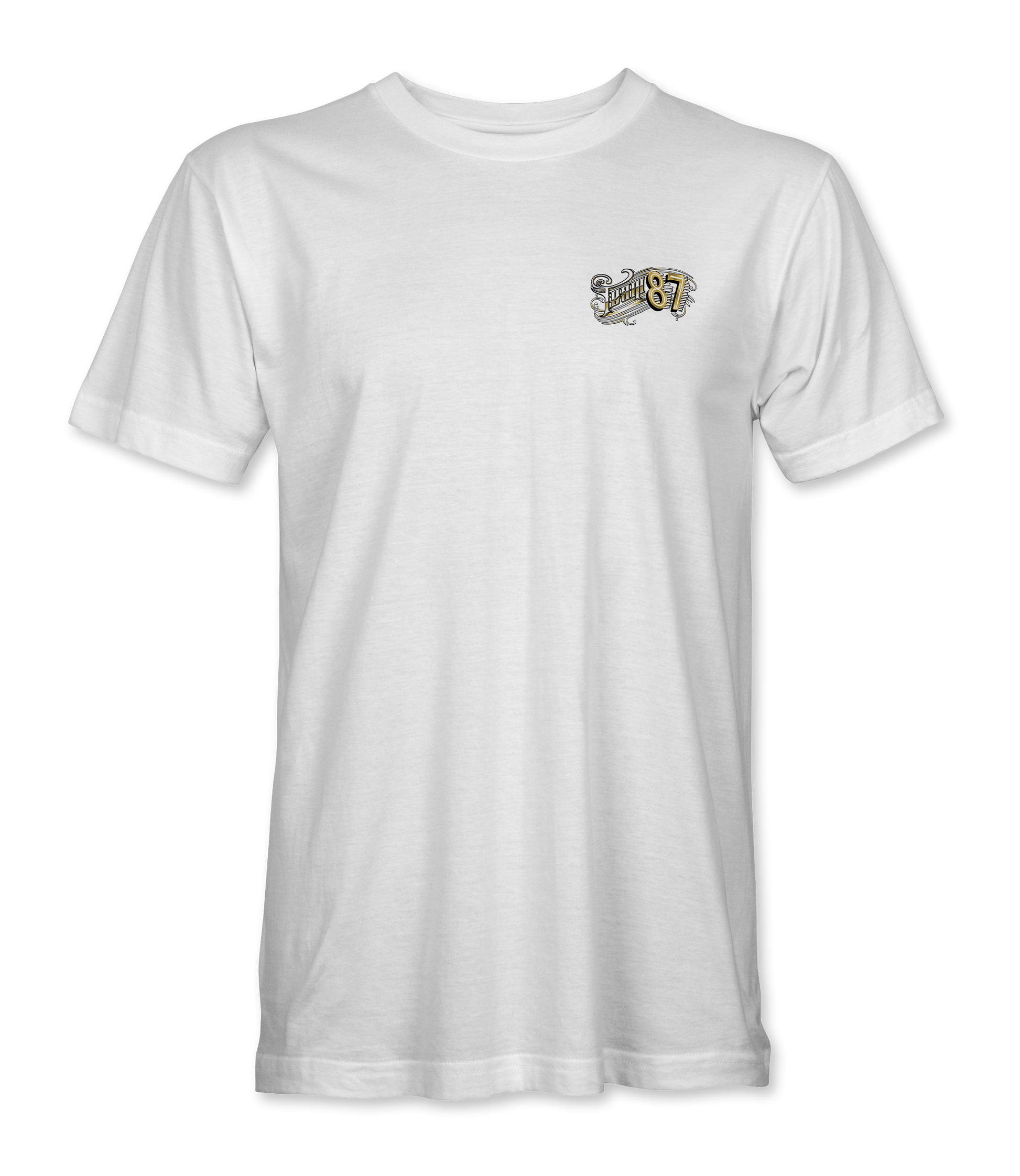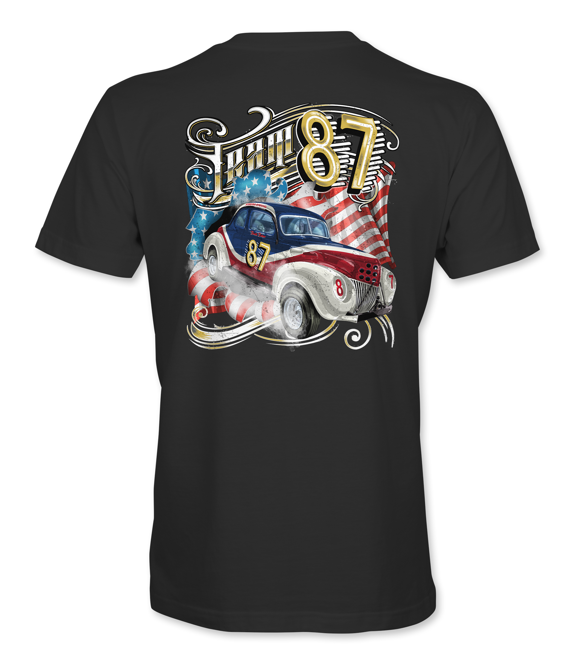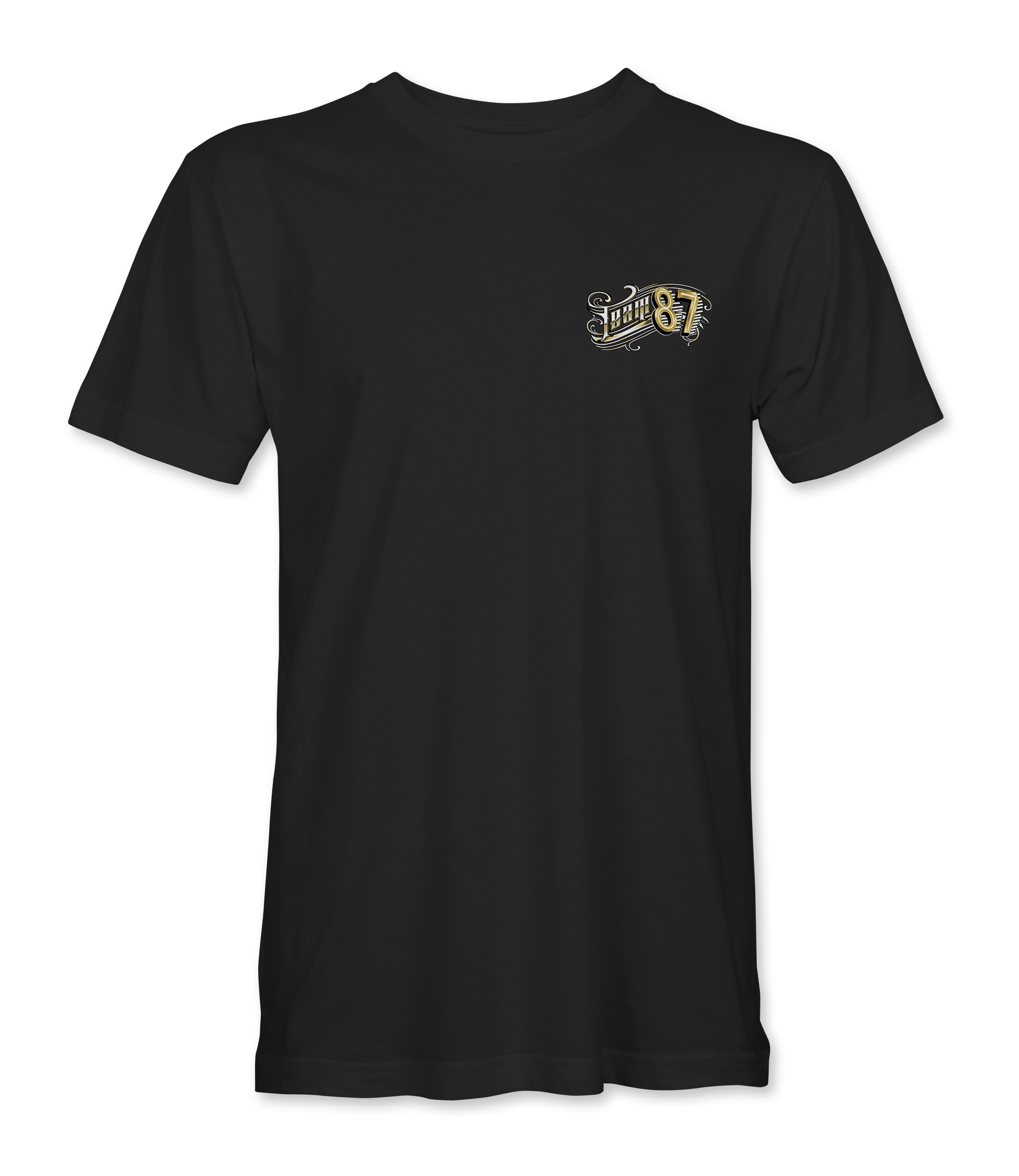 Support Team 87 with their custom apparel! Available in Black, White, and Sport Gray. Graphics are direct to garment printed with a left chest image and a full back image.
