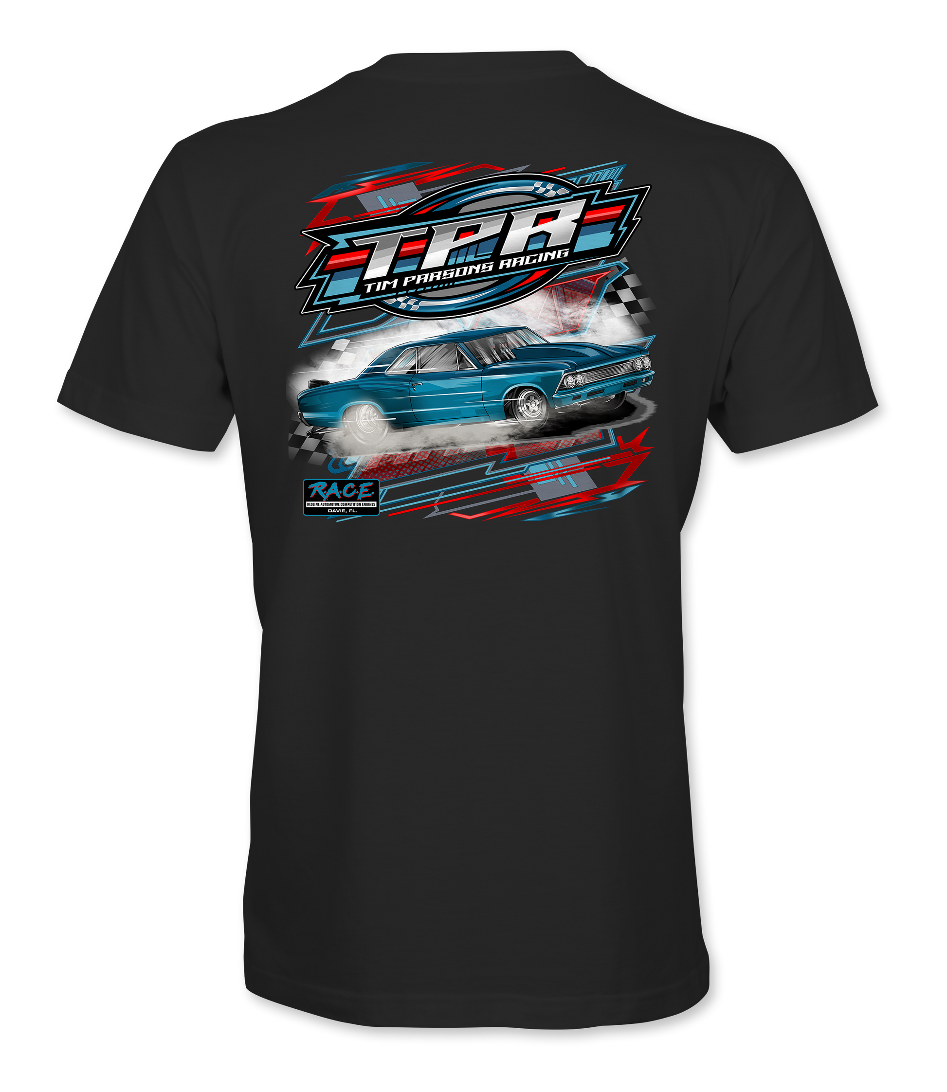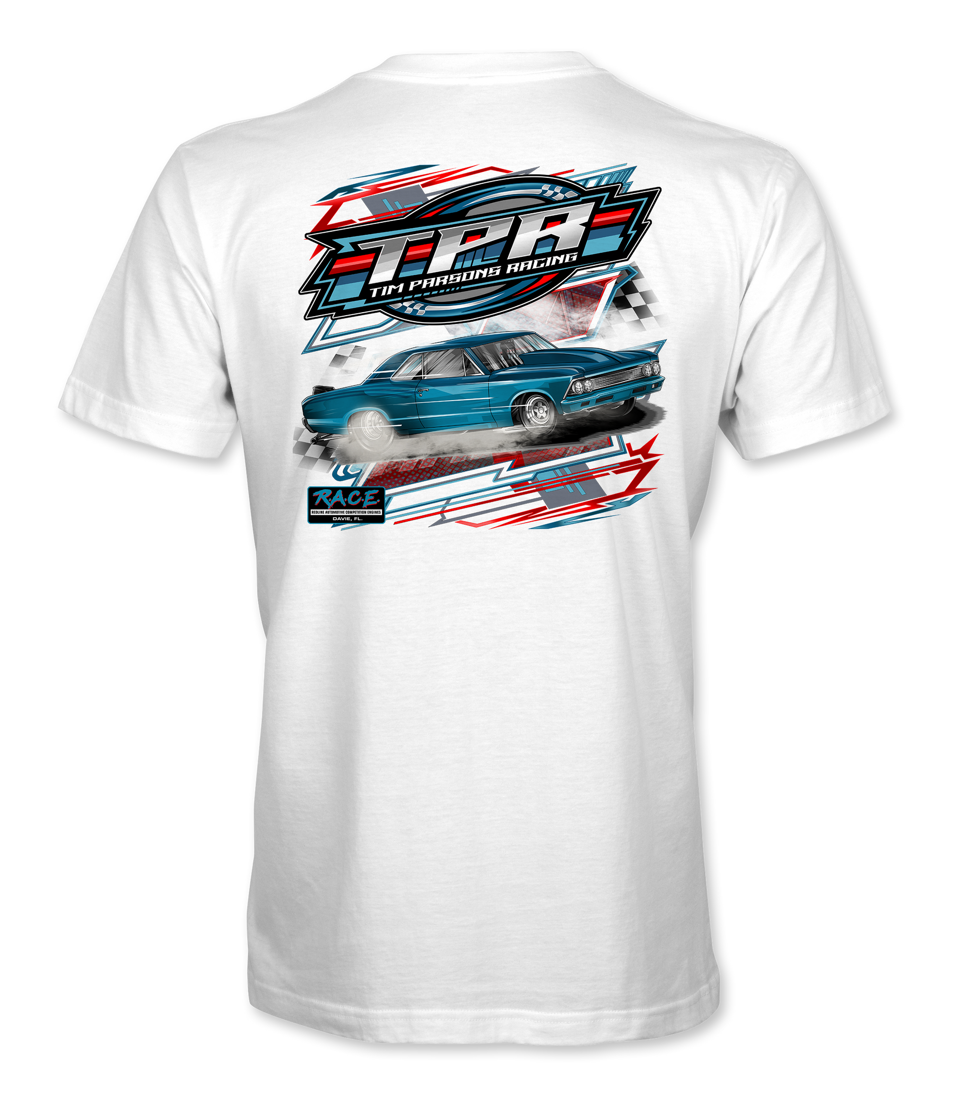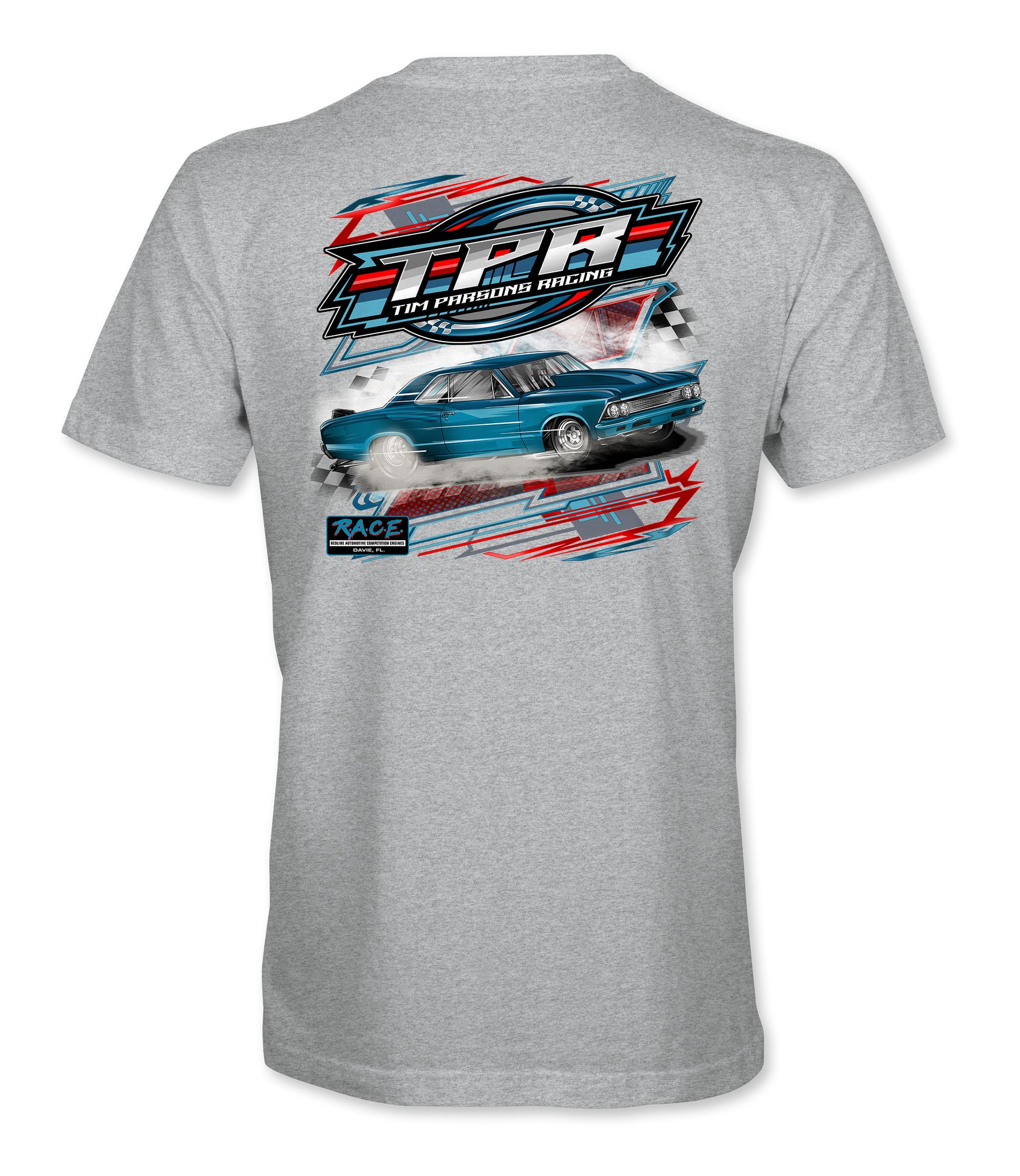 Support Tim Parsons Racing and their team with their custom apparel! Available in Black, Sport Gray and White. Graphics are direct to garment printed with a left chest image and a full back image.