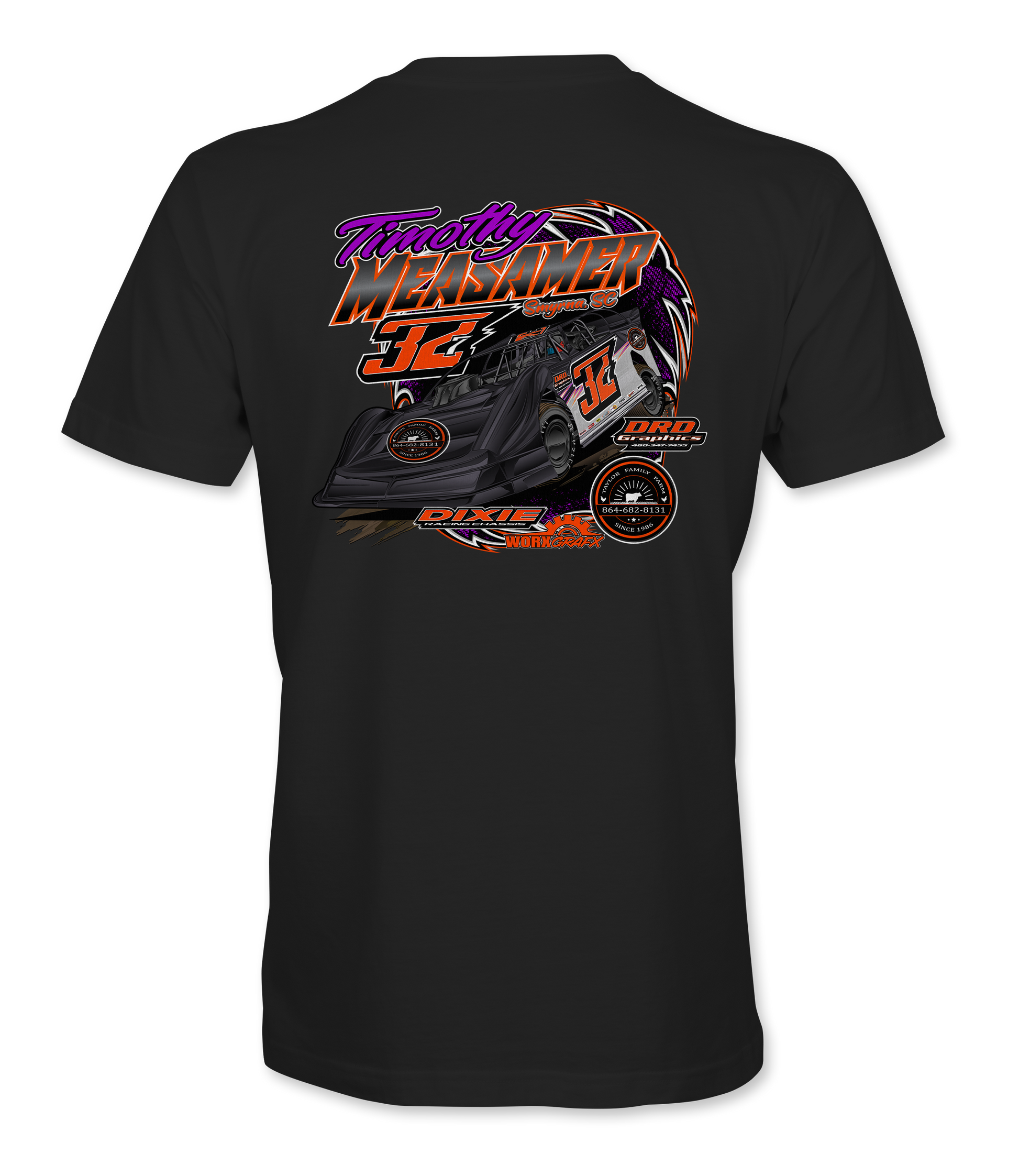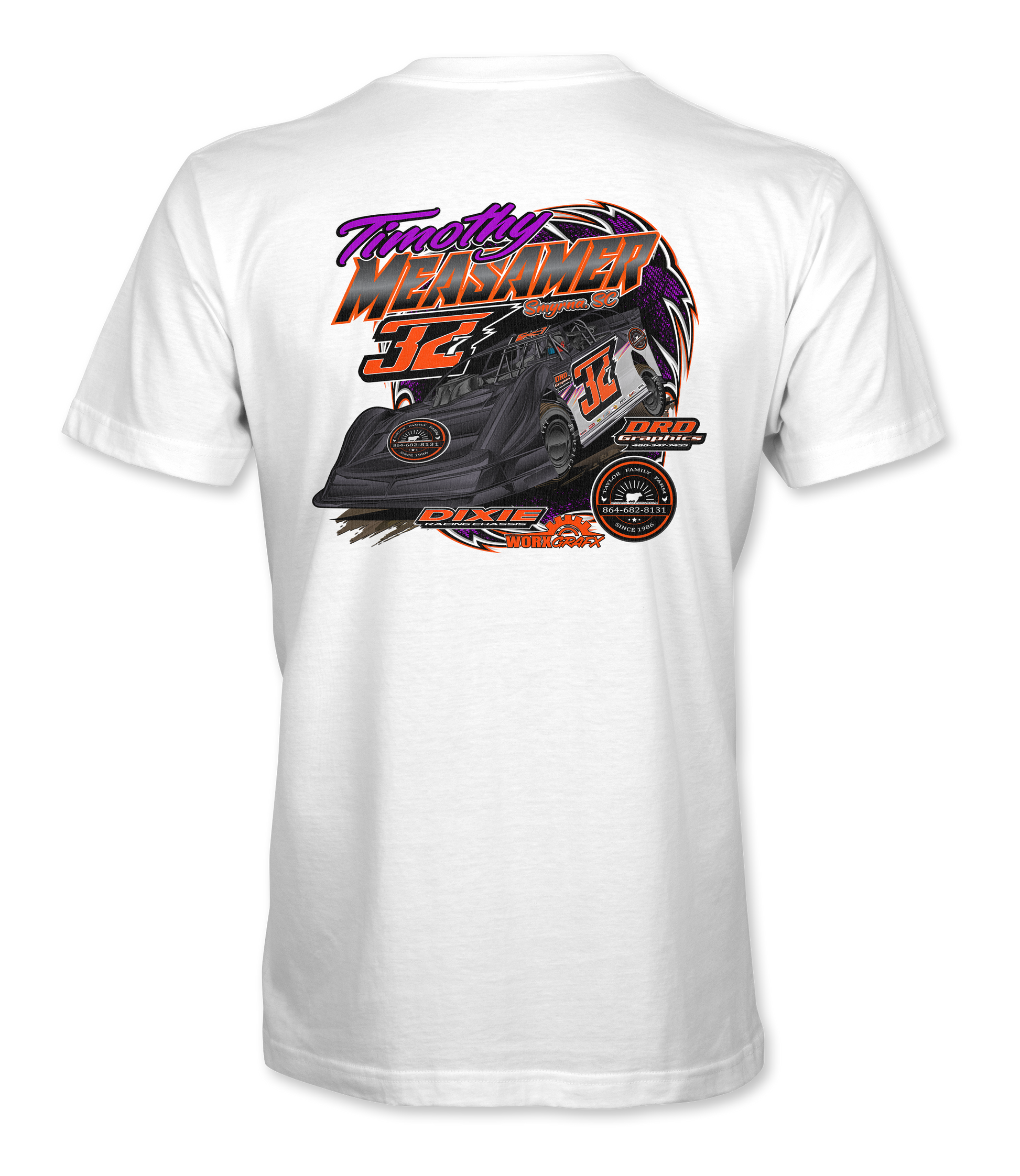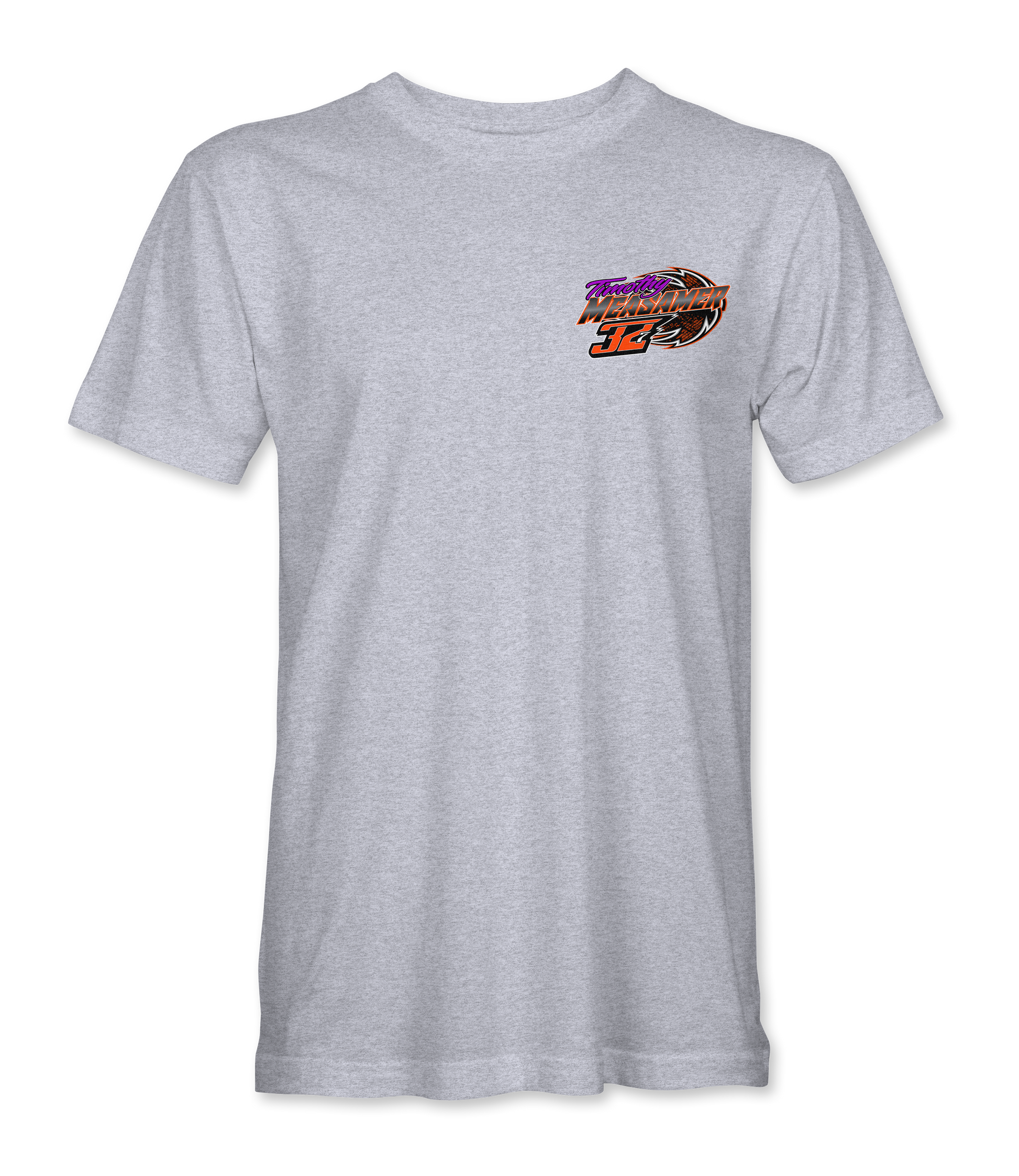 Support Timothy Measamer and his team with their custom apparel! Available in Black, Sport Gray and White. Graphics are direct to garment printed with a left chest image and a full back image.