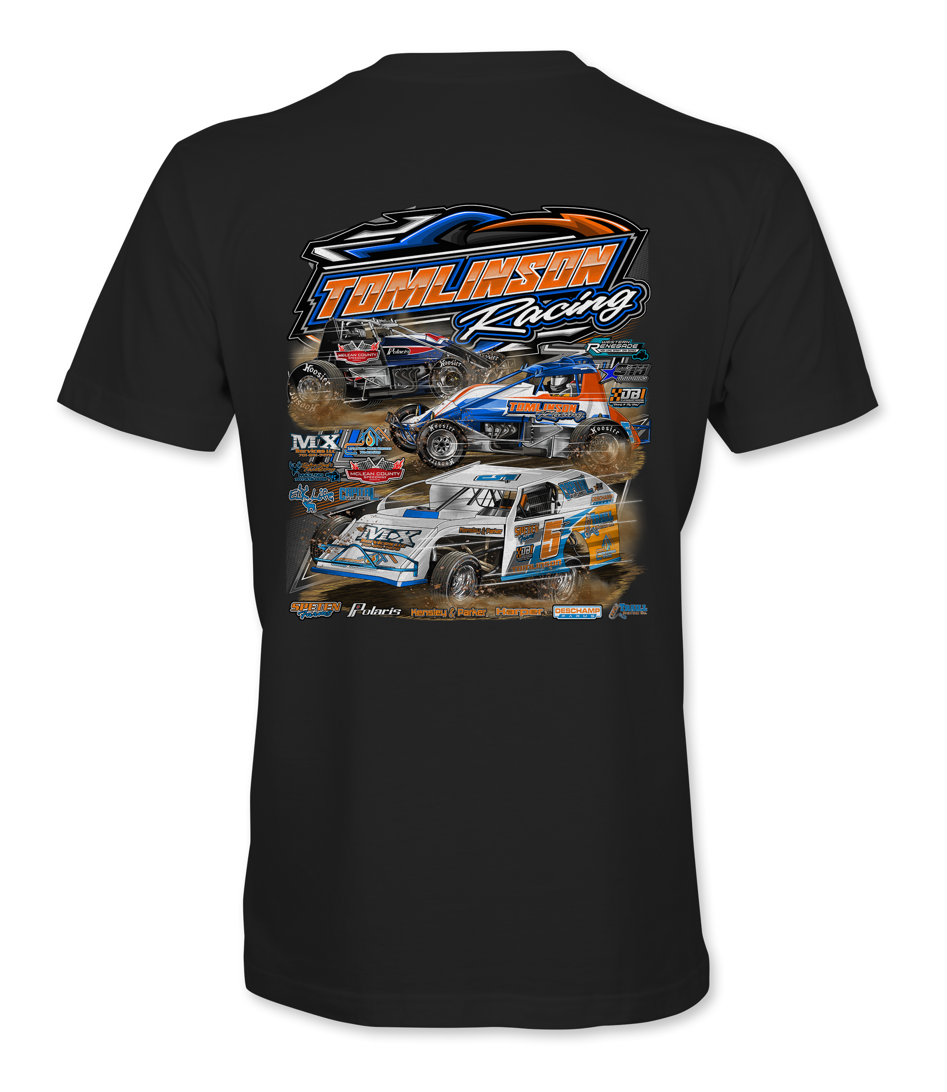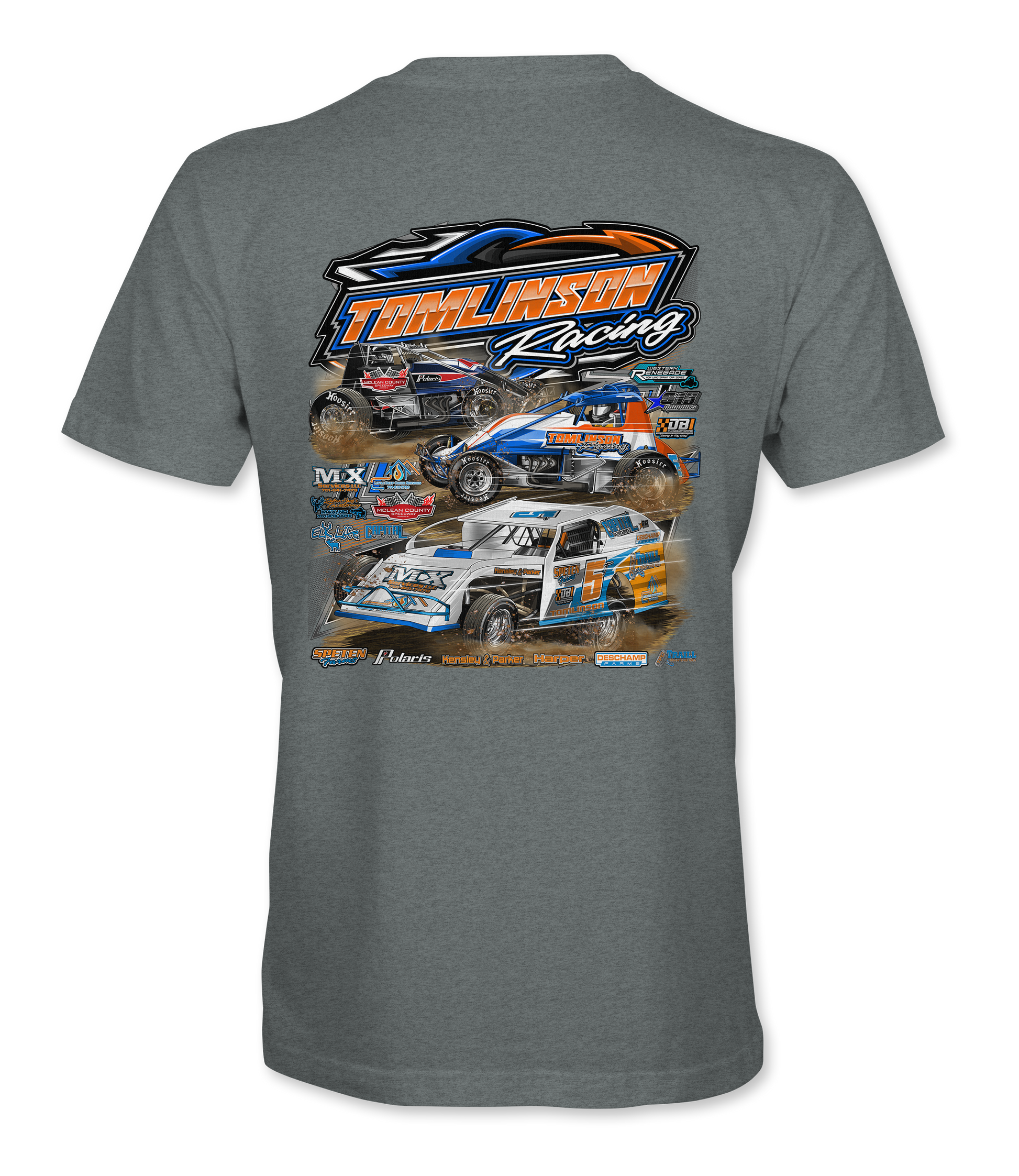 Support Tomlinson Racing with their custom apparel! Available in Black, Dark Heather and Royal Blue. Graphics are direct to garment printed with a left chest image and a full back image.