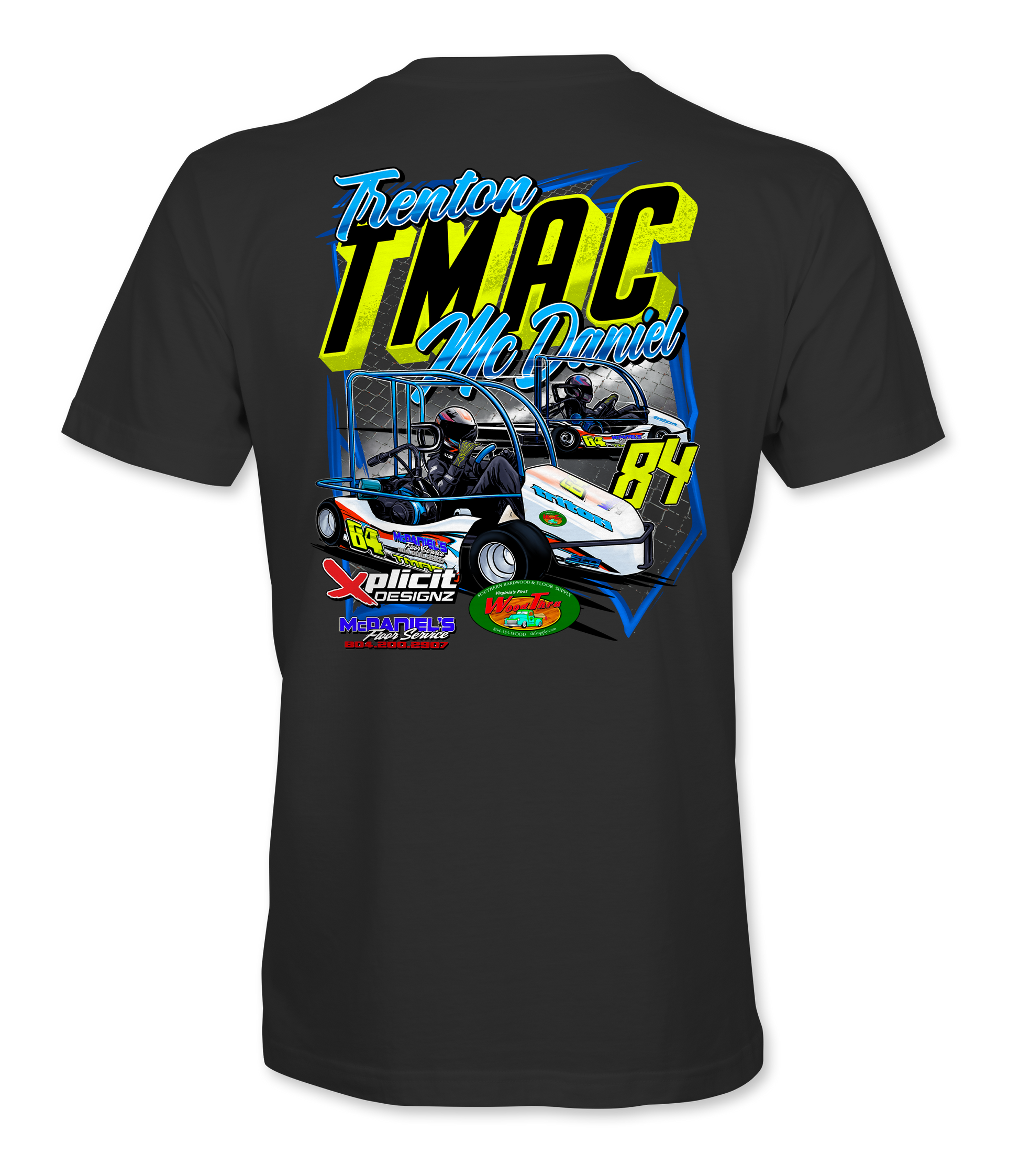 Support Trenton TMAC McDaniel and his team with their custom apparel! Available in Black. Graphics are direct to garment printed with a left chest image and a full back image.