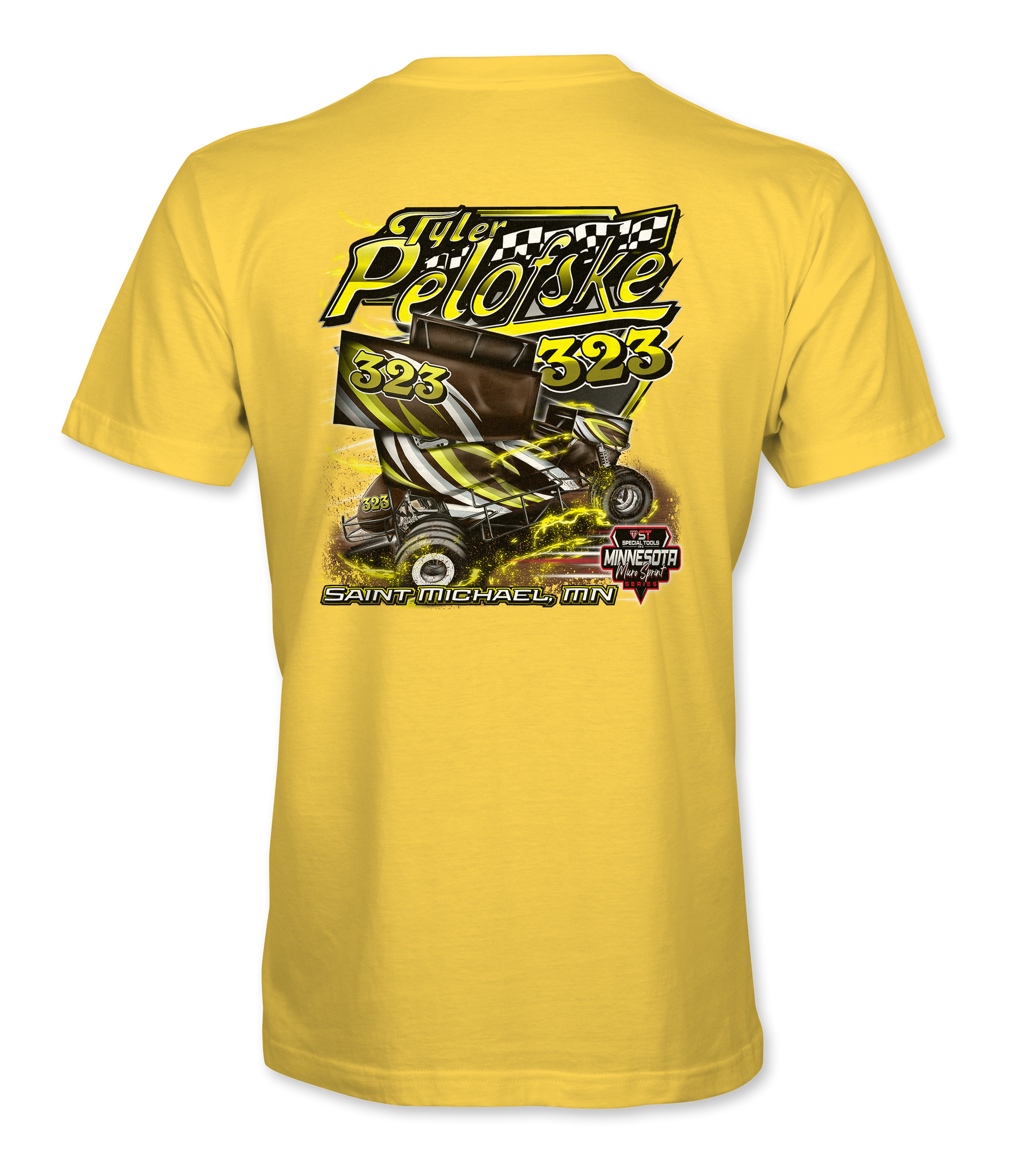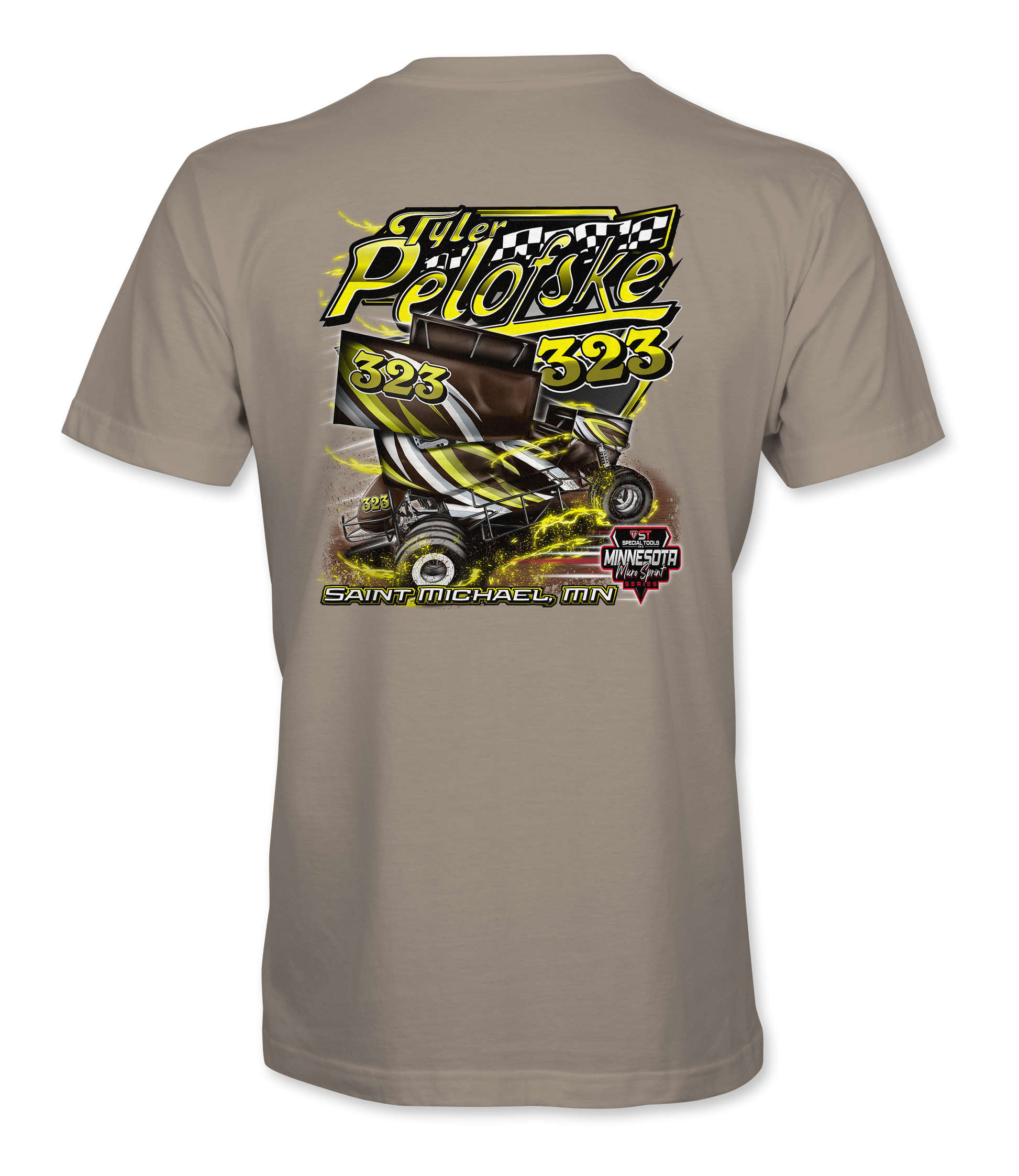 Support Tyler Pelofske with their custom apparel! Available in Black, White, Sport Gray, Brown and Daisy Yellow. Graphics are direct to garment printed with a left chest image and a full back image.