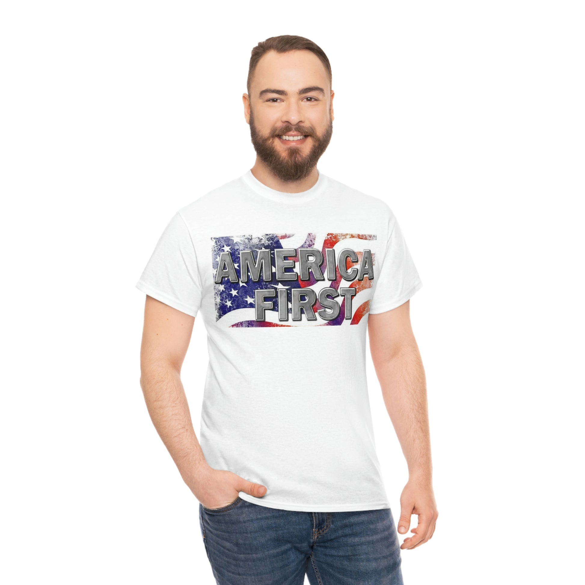 The unisex heavy cotton tee is the basic staple of any wardrobe. It is the foundation upon which casual fashion grows. America First Patriotic Theme. The specially spun fibers provide a smooth surface for premium printing vividity and sharpness. No side seams mean there are no itchy interruptions under the arms. The shoulders have tape for improved durability.