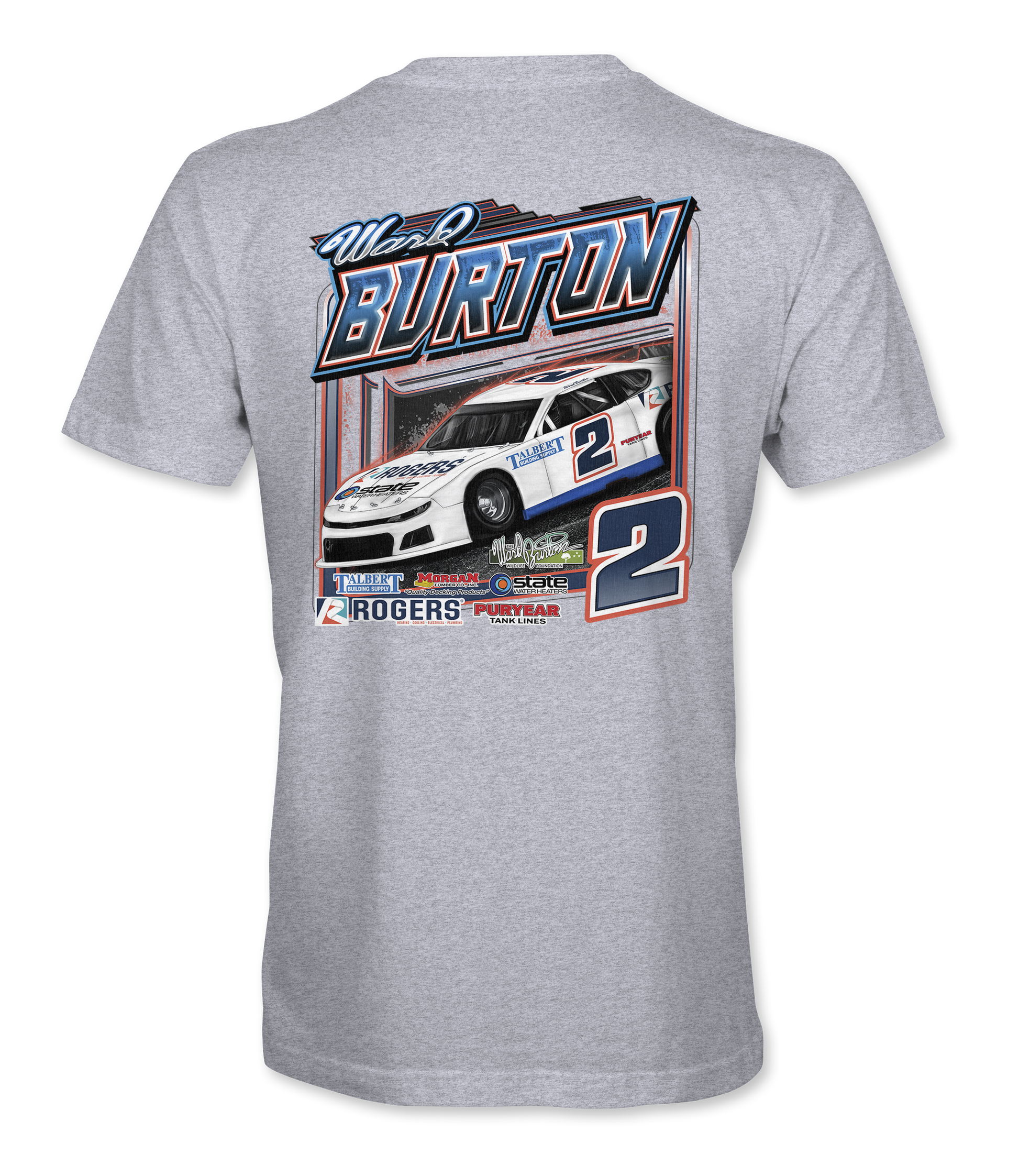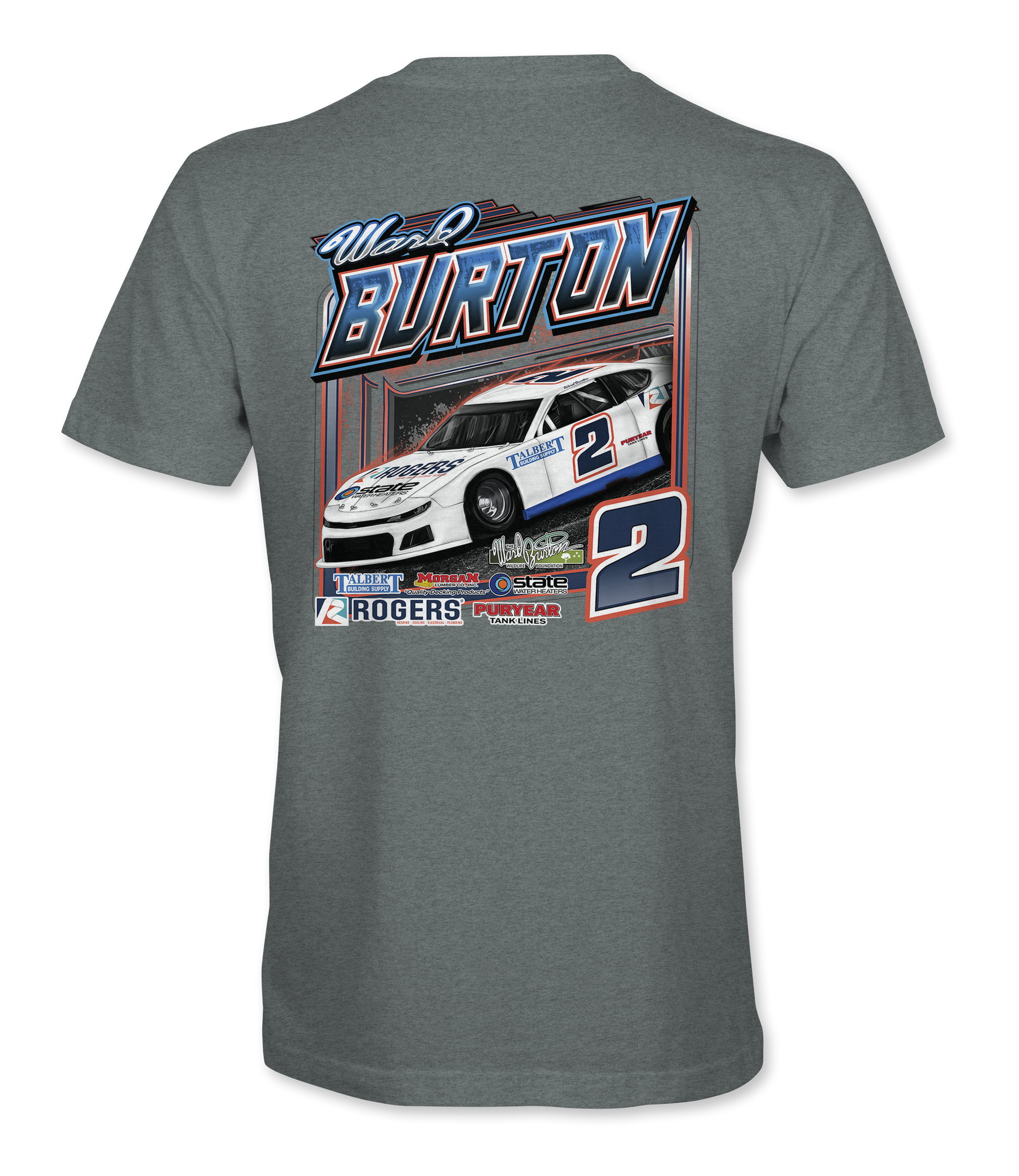 Support Ward Burton with their custom apparel! Available in Black, Dark Heather and Sport Gray. Graphics are direct to garment printed with a left chest image and a full back image.