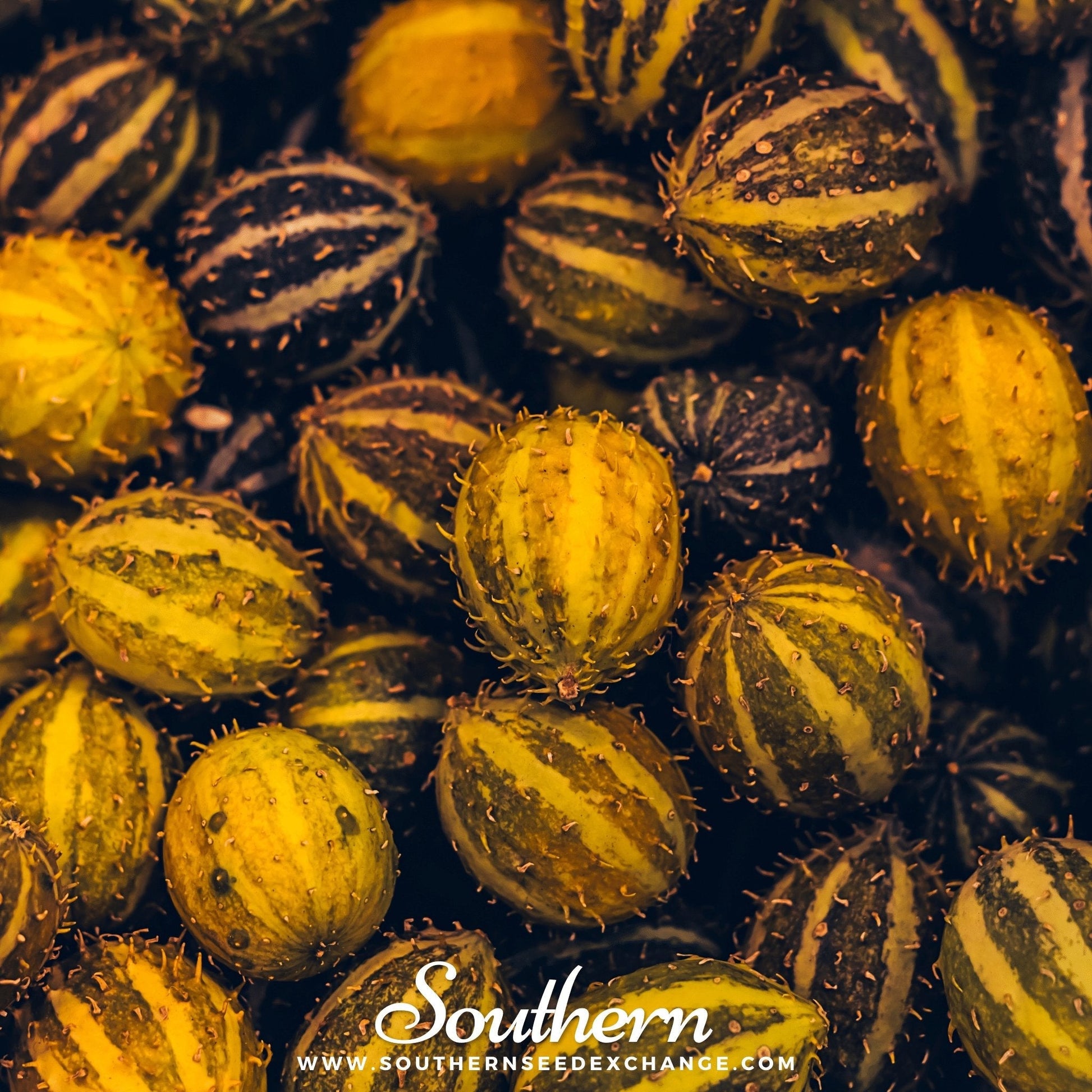 West Indian Gherkin grow extremely vigorous vines that are excellent for all gardens, space permitting. These plants grow so prolifically that fruits can be harvested throughout the entire summer and won't wilt in the heat, and vines don’t leave room for weeds. Fruits are 3-5” long and have a rounded shape, covered in small spikes.