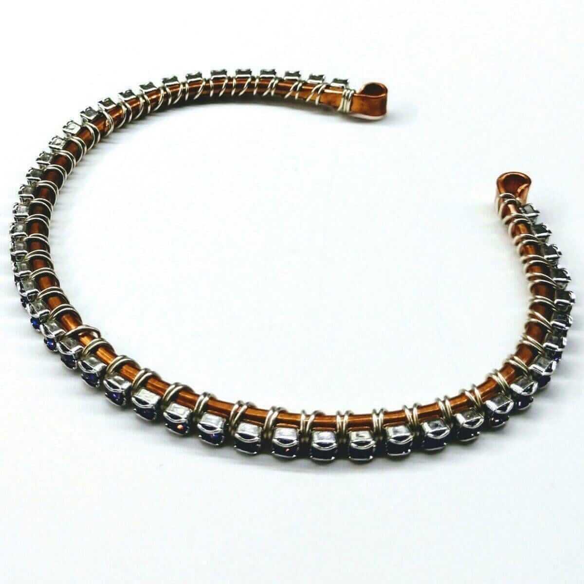 Elevate your style with our Wire Wrapped Amethyst Crystal Tennis Bracelet Bangle. This stunning piece features wire-wrapped amethyst crystals for a truly unique and eye-catching design. Feel the positive energy of amethyst while adding a touch of elegance to any outfit. A must-have for any jewelry collection! Gorgeous handcrafted slim 12 gauge stackable adjustable copper bangle. Each bangle features amethyst color Swarovski crystal rhinestone chain wire wrapped with sterling silver wire around the top of the bangle. The ends of the bangle are flattened, hammer-patterned and coiled. The bangle adjusts to a 6 1/2-7-inch wrist.