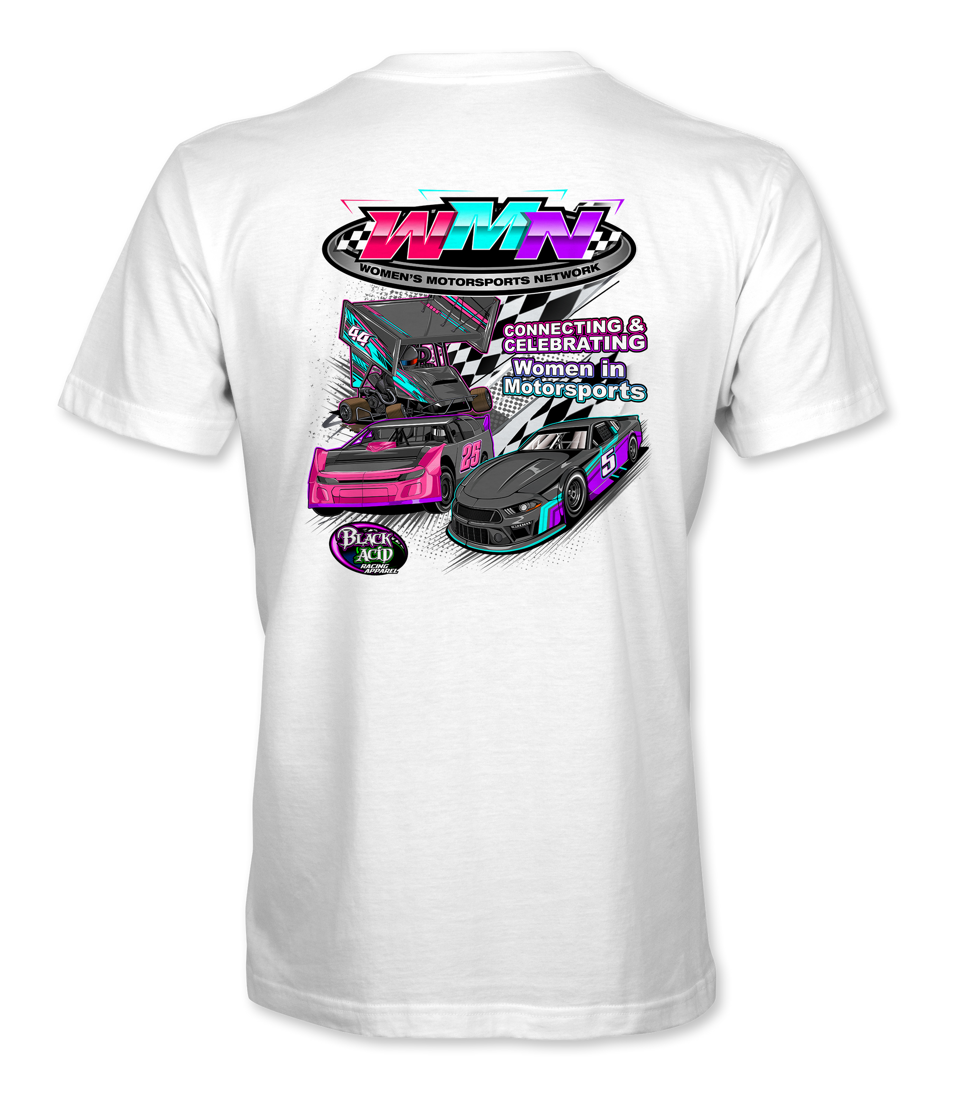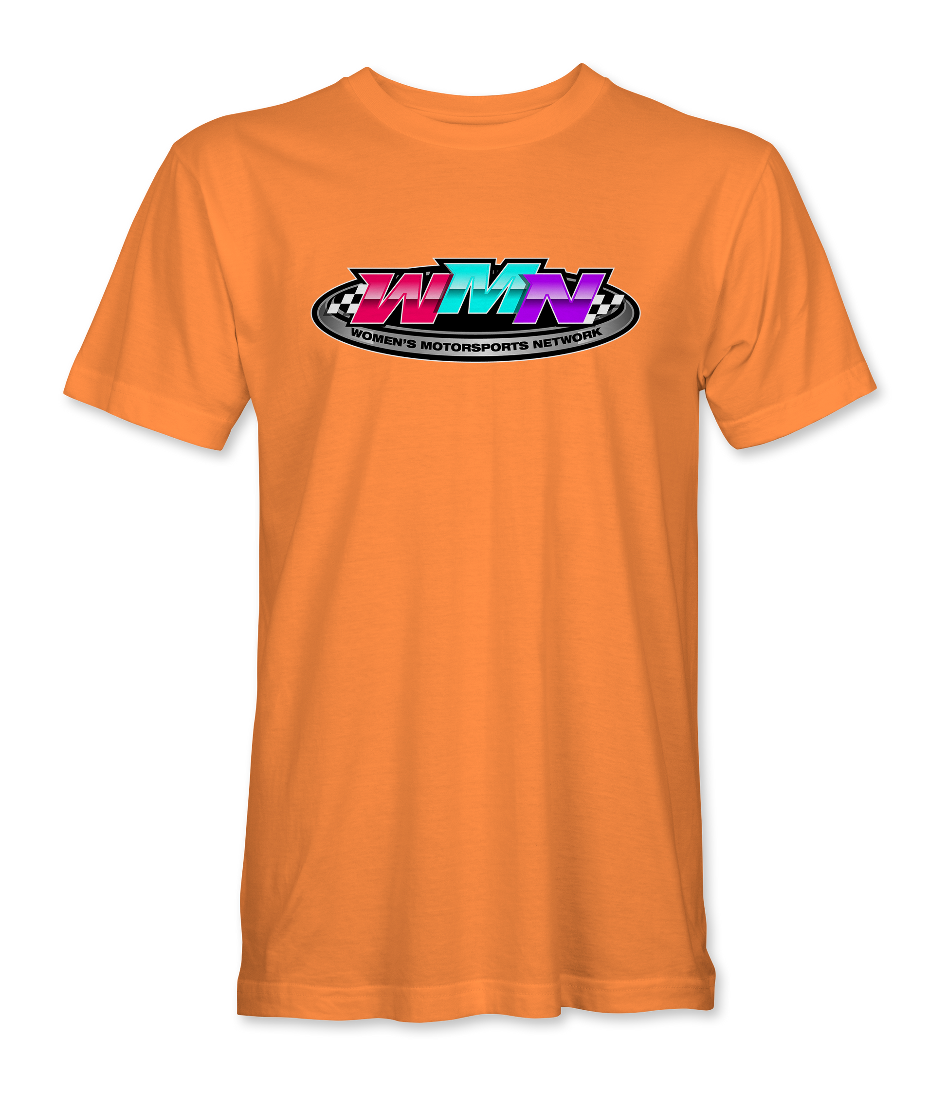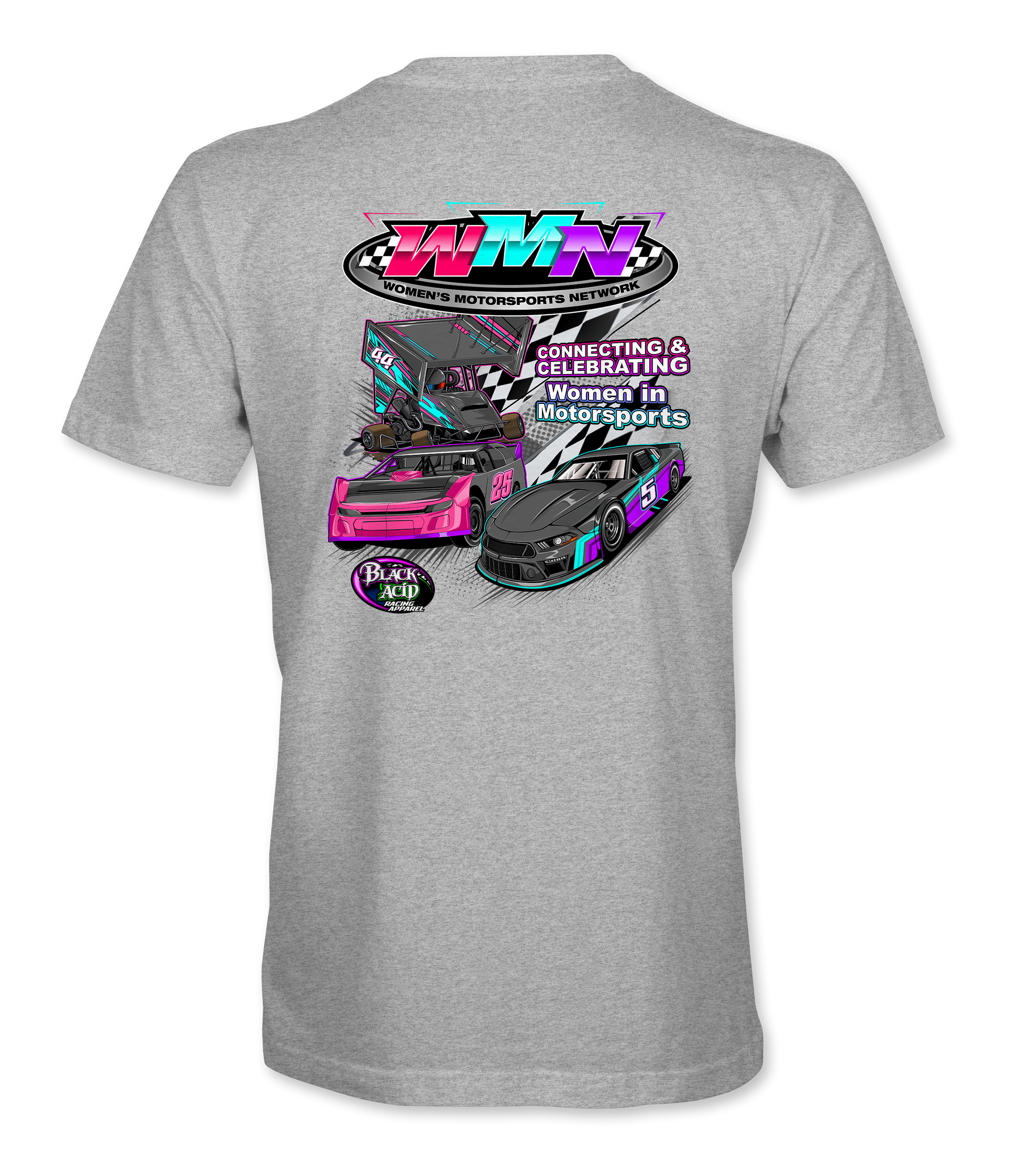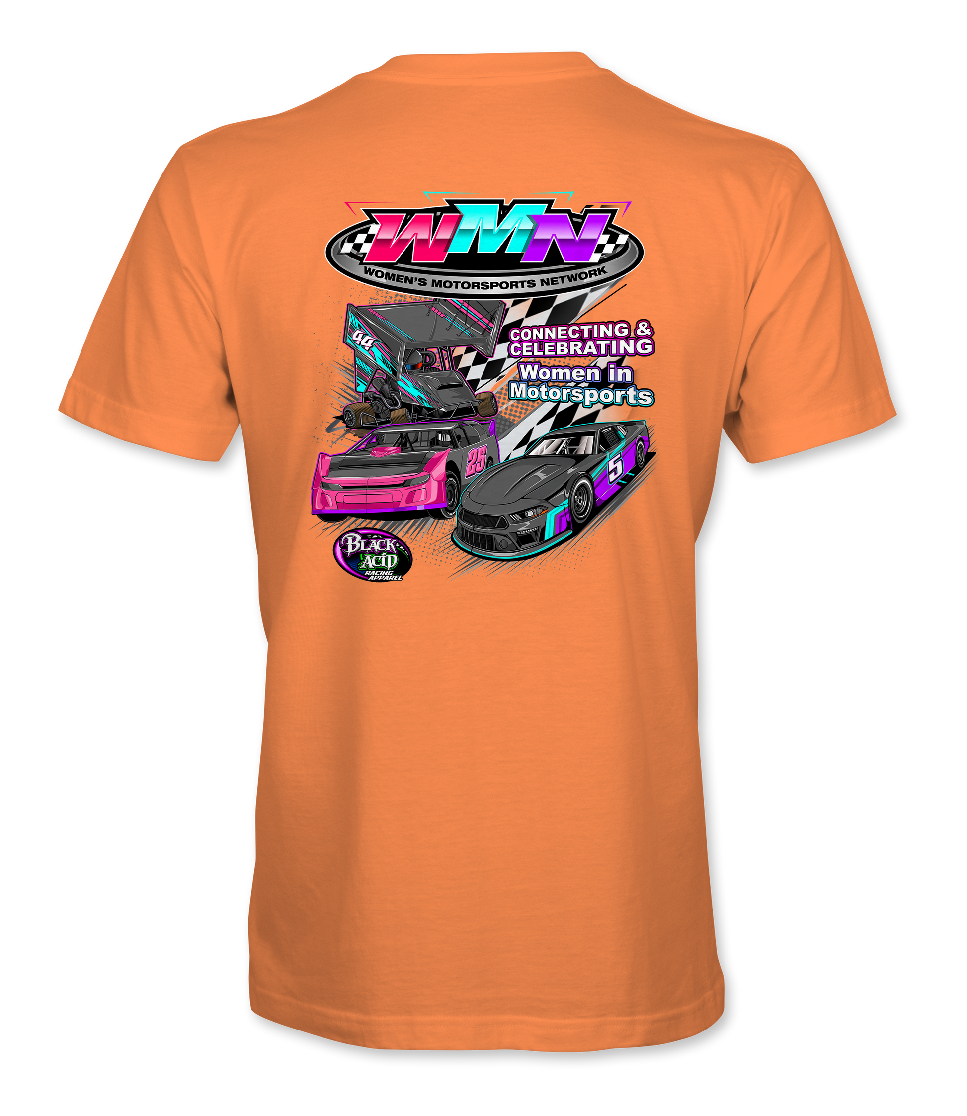 Support the Women's Motorsports Network with their custom apparel! Available in Black, White, Sports Gray, Orange and Pink. Graphics are direct to garment printed with a full chest image and a full back image.