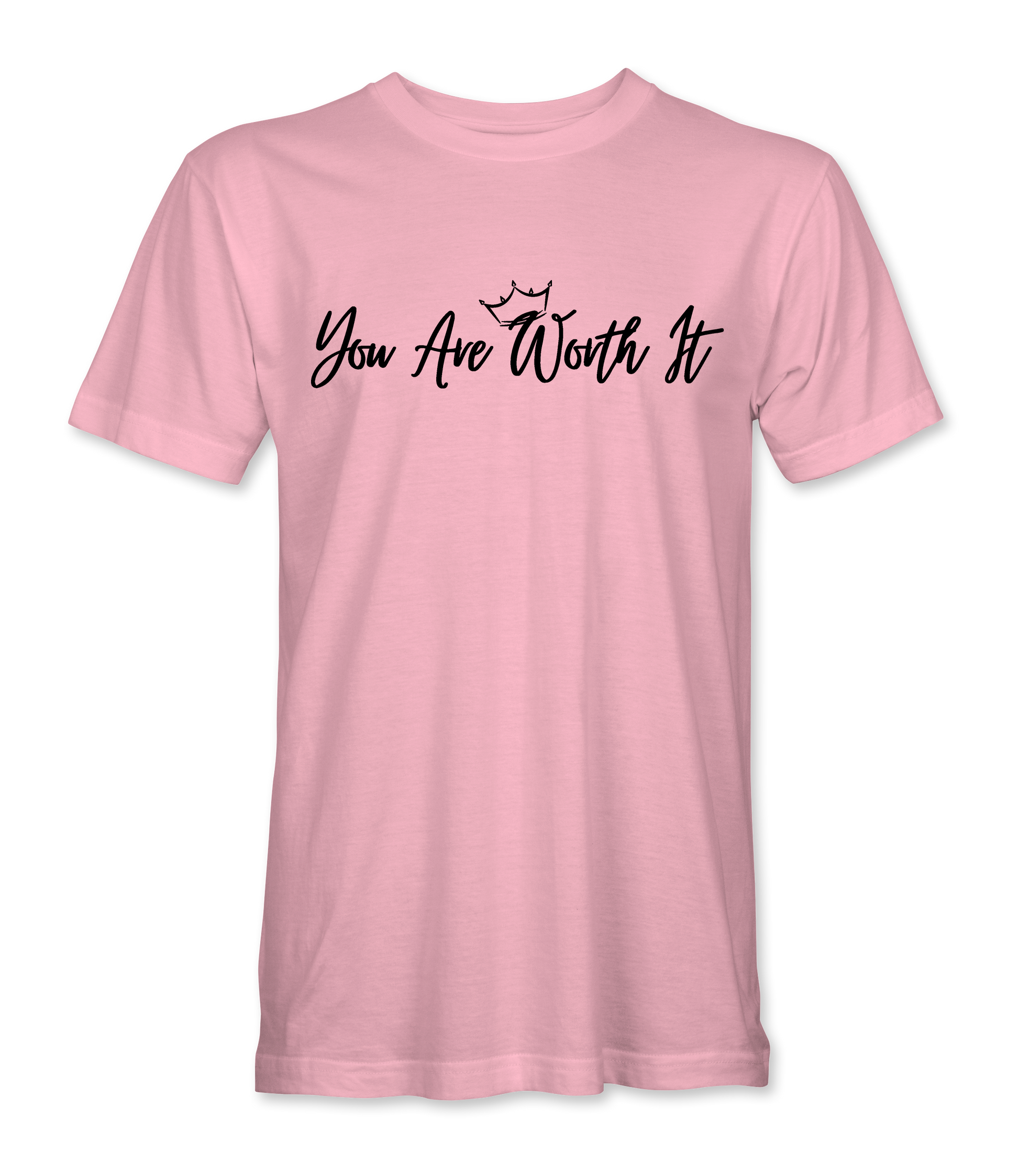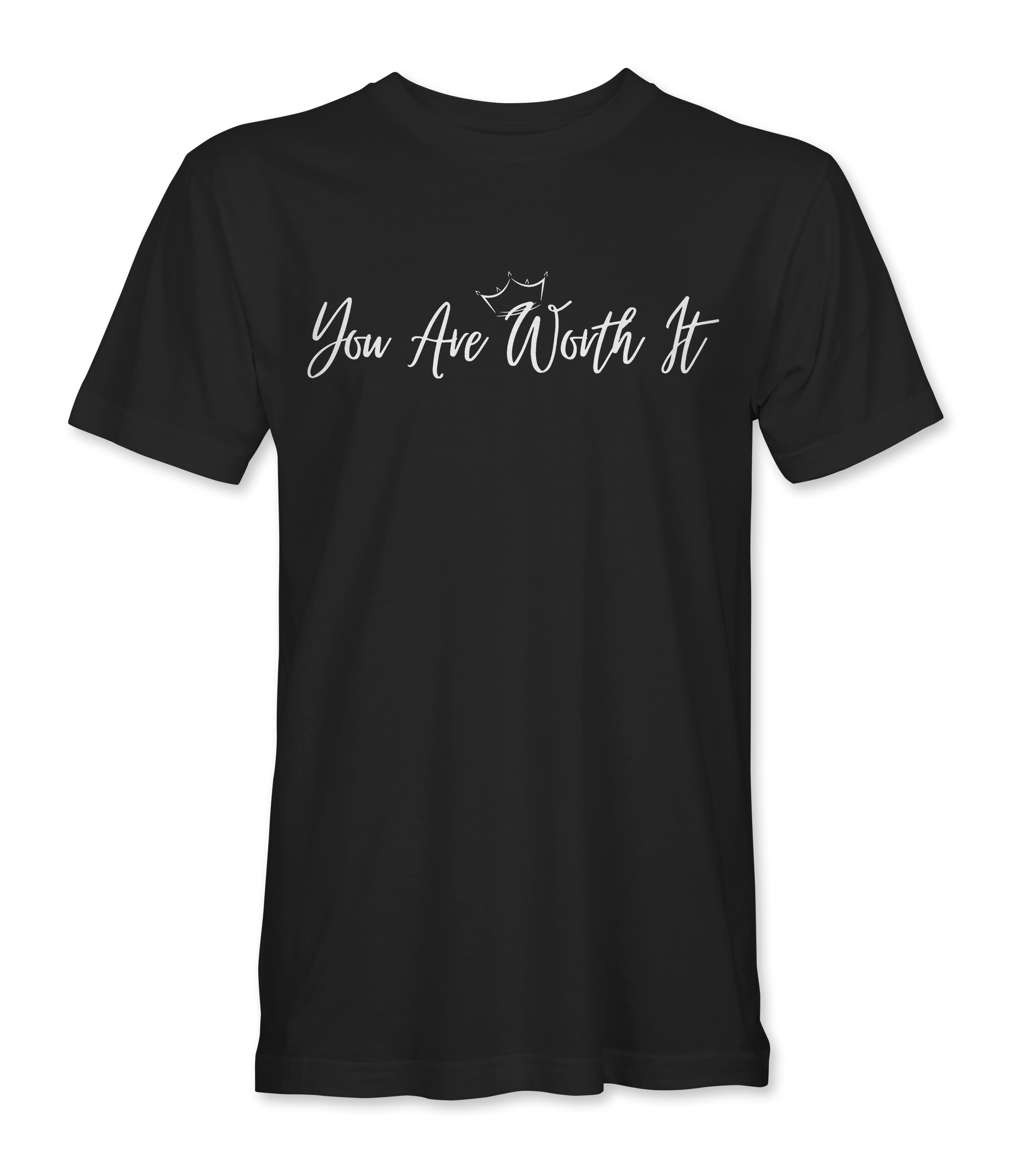 Support The You Are Worth It Movement and their team with their custom apparel! Available in Black. Graphics are direct to garment printed with a left chest image and a full back image.